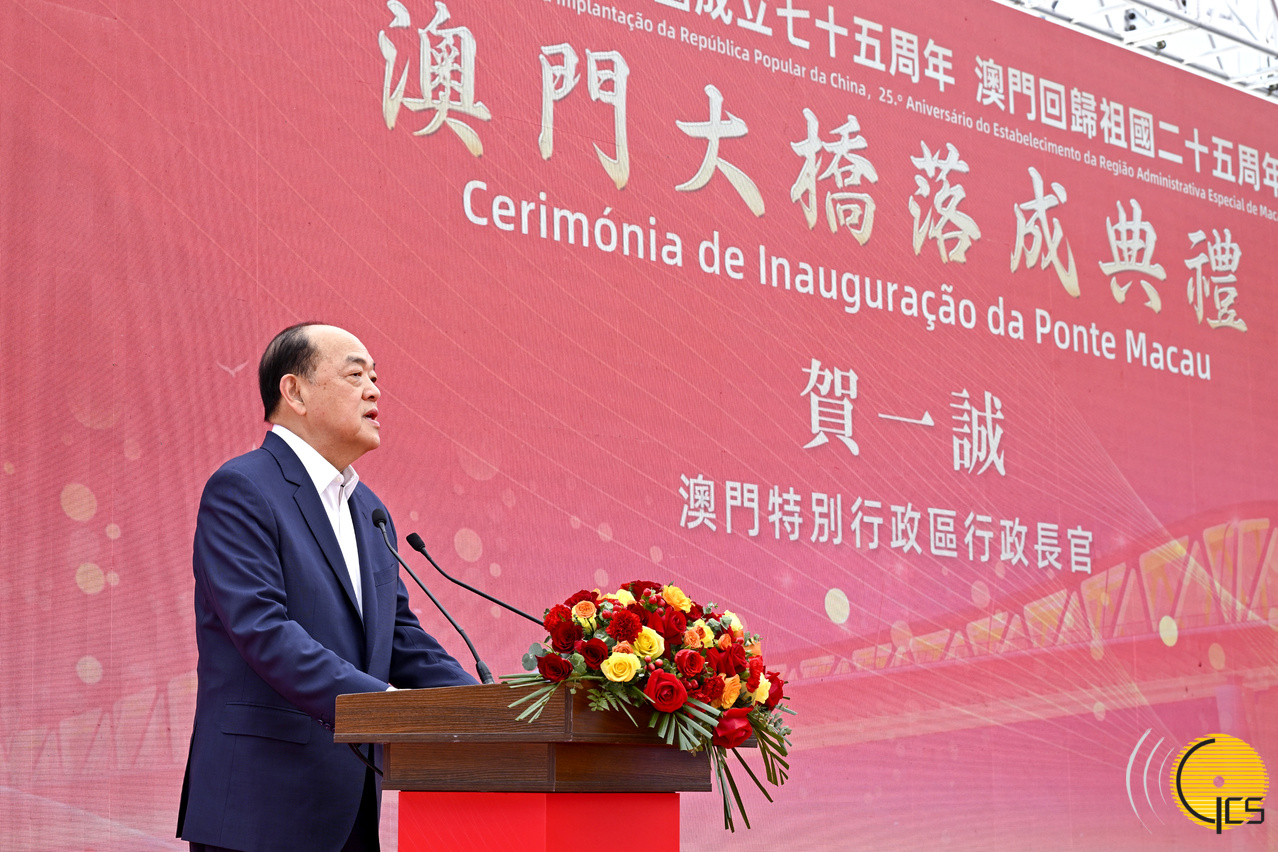 • The Chief Executive, Mr Ho Iat Seng, delivers a speech at the inauguration ceremony of the Macao Bridge.