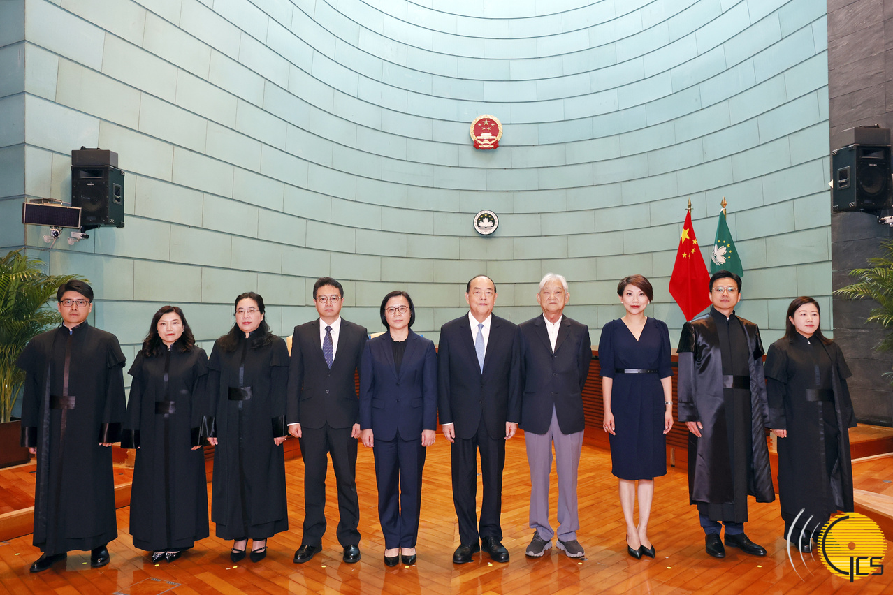 • The Chief Executive, Mr Ho Iat Seng, Acting President of the Court of Final Appeal, Ms Song Man Lei, and the Chairman of the Independent Commission on the Recommendation of Judges, Mr Lau Cheok Va, pose for a photograph with newly inaugurated judges of the Court of First Instance.