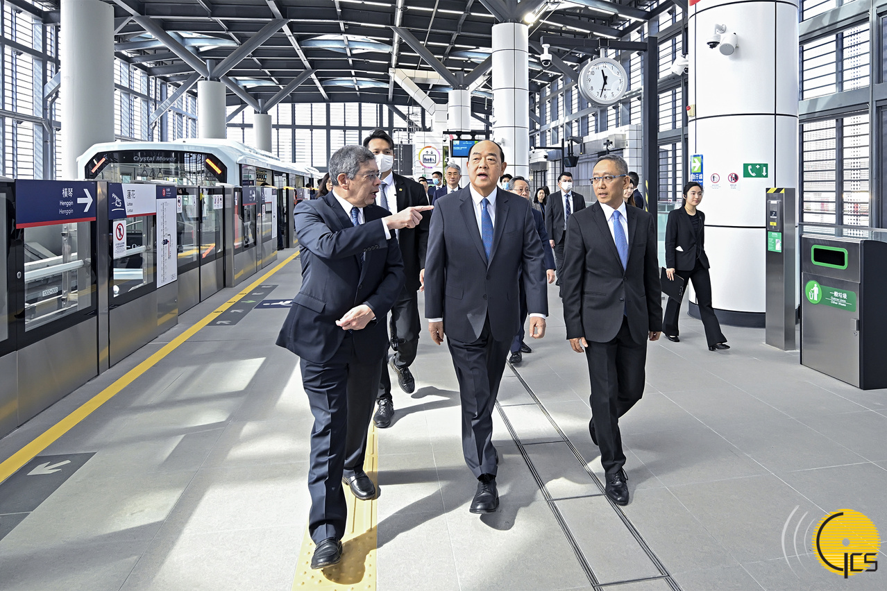 • The Chief Executive, Mr Ho lat Seng, tours the exchange passage at the Lotus Station of the Light Rapid Transit.