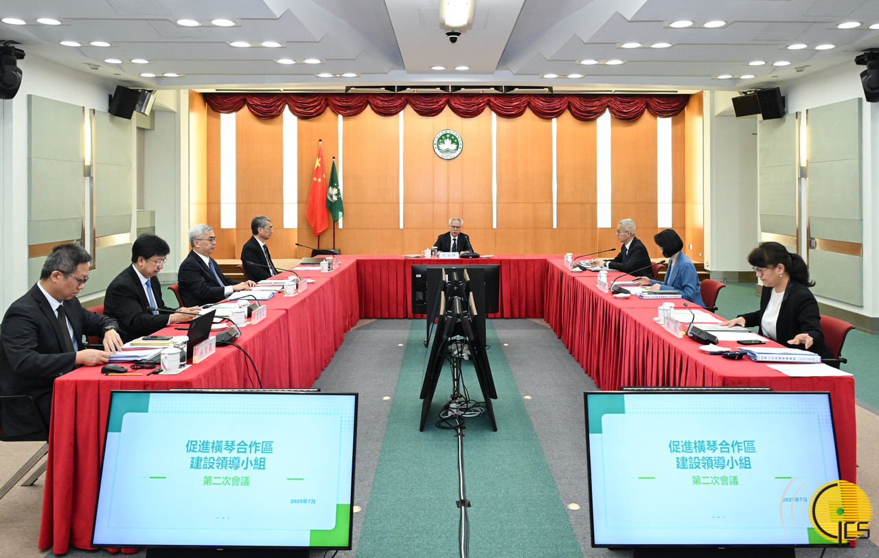 The Chief Executive, Mr Sam Hou Fai, chairs a meeting of the leading group for the promotion of the construction of the Guangdong-Macao Intensive Cooperation Zone in Hengqin.