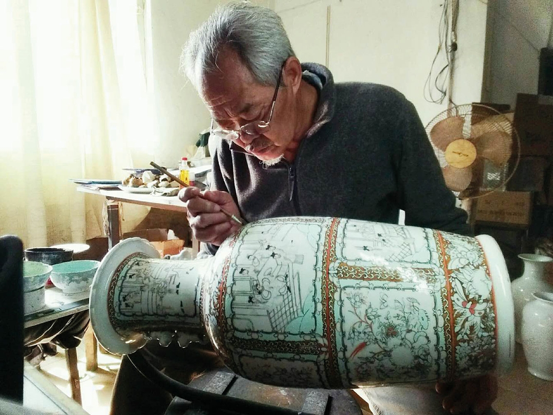 For the past 60 decades, much of the Macao-born ceramic artist Lei Iat Po’s life has revolved around Guangcai porcelain. He’d always been into painting; the 70-year-old recalls his grandfather rewarding him for a particularly beautiful goldfish he’d painted as a young boy. Later, he worked at his father’s porcelain factory in Areia Preta, in the north of Macao. Then Lei went on to open his own Guangcai operation in the mainland before returning to Macao.