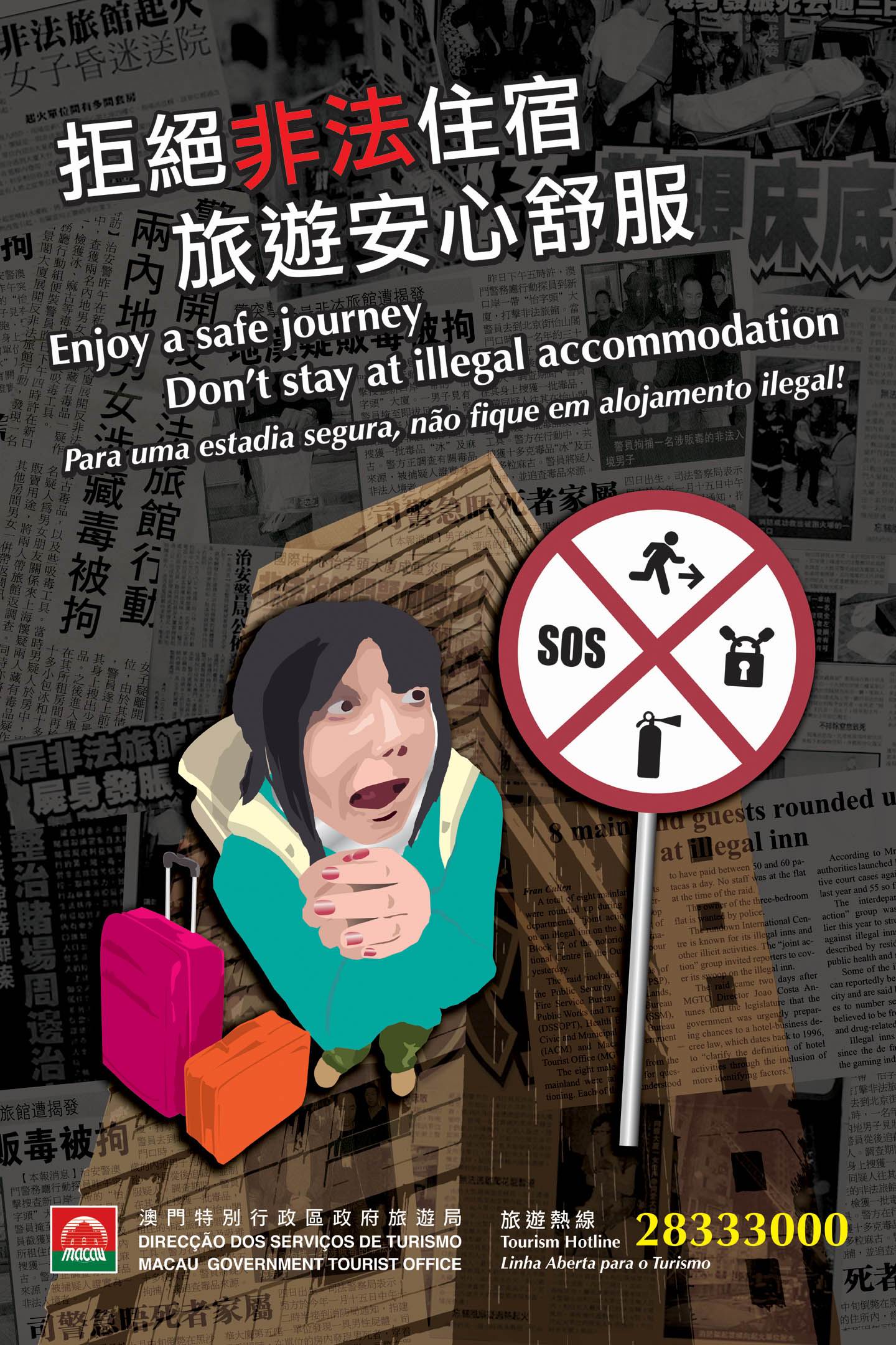 The Working Group pointed out that amendments on existing legislation are necessary to put an end to the problem of illegal accommodation. While the legislation for the issue is in an advanced stage of revision, the related governmental departments will continue to take enforcement actions to crack down on illegal accommodation. The campaign launched by the Working Group today, which includes posters distribution and reinforcing Tourism Hotline 28333000 for the reporting on any illegal accommodation cases, seeks to promote awareness among visitors and residents of the problem of illegal accommodation.