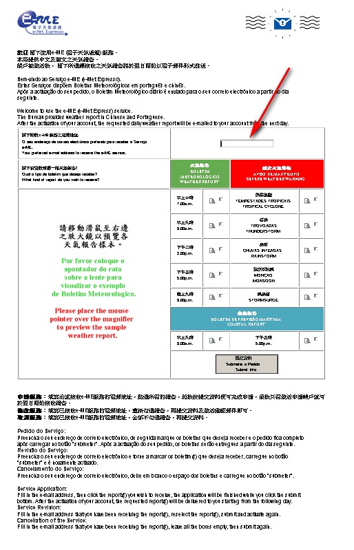 The Meteorological and Geophysical Bureau (SMG) in March last year launched the e-ME Service (e-MET Express). Public can receive the electronic version of the weather and wave reports via email after registration. Reports include the 7:00 am weather report, 9:00 am weather report and wave report, 14:00 weather report, 17:00 weather report and wave report, and 21:00 weather report.