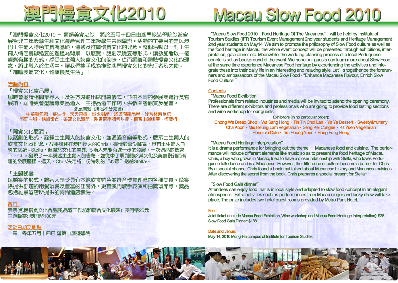 The Institute For Tourism Studies, Macao will host the “Macau Slow Food 2010 – Food Heritage of the Macanese” on 14 May. The event is organized by the Tourism Event Management and Heritage Management Year 2 Students and supported by the IFT Student Union. The objective of the event is to promote the philosophy of Slow Food culture, as well as the food heritage in Macao.