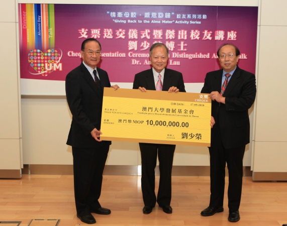 At the cheque presentation ceremony held today (17 September 2010), Dr. Lau presented the dummy cheque to Dr. Tse Chi Wai, Chair of the Executive Committee of UMDF and Chair of the University Council of UM, who received the cheque on behalf of UMDF. UM Rector Wei Zhao said in his speech that, “A university cannot grow without its alumni and community support.” He added that donations from UM alumni “have always been important in driving the University’s pursuit of excellence,” and that “Dr. Lau takes the lead to make another large donation to his alma mater as a means to inspire fellow alumni and students to support the University in its 30th anniversary next year.” In closing, Rector Wei Zhao said that “It is both the University’s hope and Dr. Lau’s hope that his continuous generosity can encourage people including our alumni to support the development of the University.”