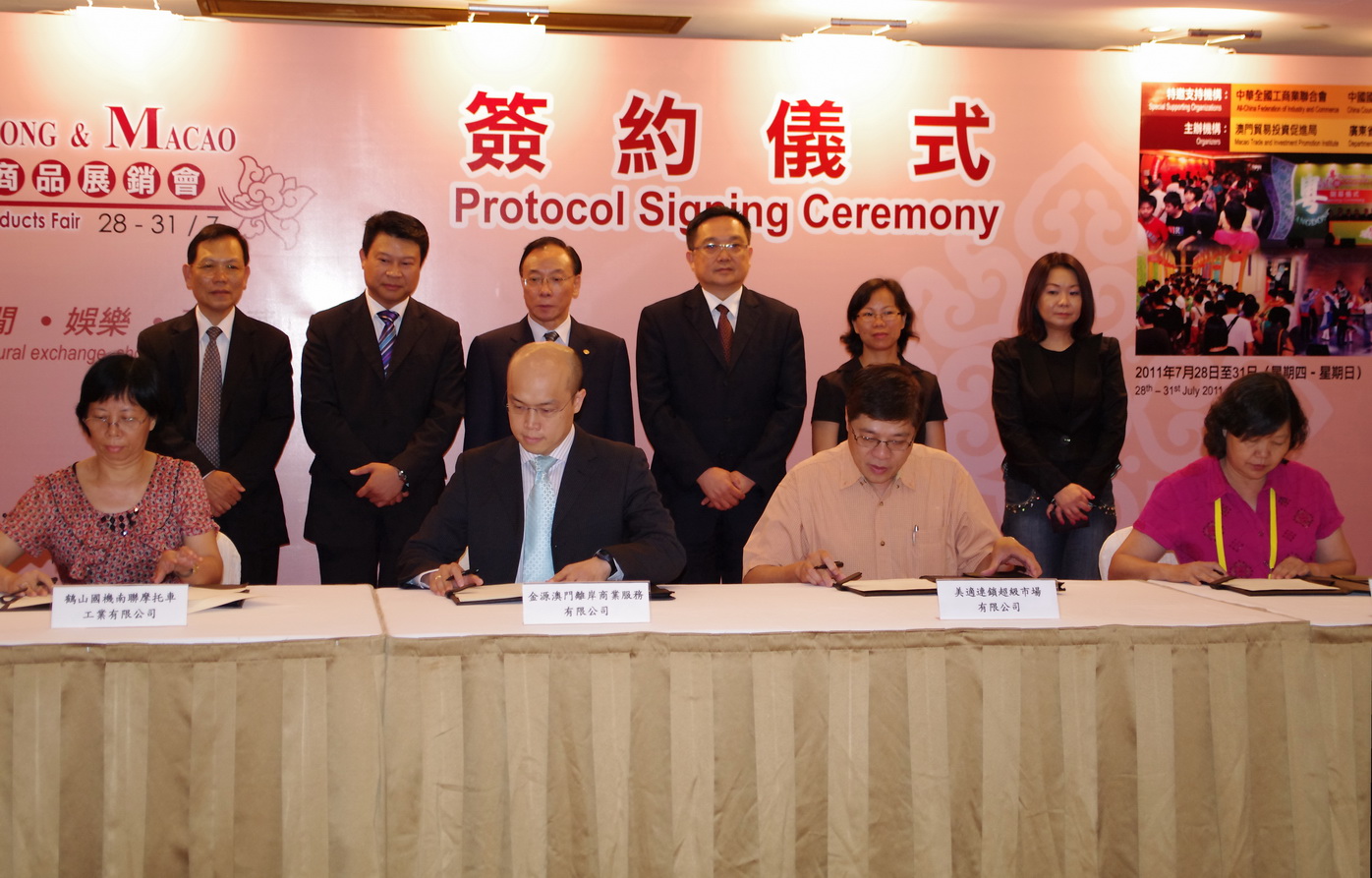 Exhibitors and buyers continued to meet each other today at the business matching area. Two hundred and thirty-one sessions of business matching were successfully held, and three protocols (one was signed out of the ceremony) were signed. The protocols are “Intention of purchase of motorbikes”, “Sales Agreement on Chinese Foodstuff” and “Sales Agreement on Organic Buckwheat Food”. Investing parties come from Jiangmen, Huizhou and Macao. Mr. Jackson Chang, President of Macao Trade and Investment Promotion Institute; Mr. Vong Kok Seng, Vice-President of Macao Chamber of Commerce; Ms. Zhao Zhuang Hao, Representative of The Bureau of Foreign Trade and Economic Cooperation of Jiangmen Municipality; Mr. Kevin Bi, Director of The Association of Advertising of Macau; Ms. Sandy Leong, Director of Macao Department Store and Provision Association; and Mr. Ieong Man Kin, Director of Macau Association of Retailers & Tourism Service witnessed the contract signing ceremony.