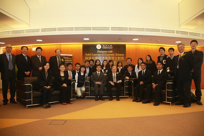 The seminar was organized by UM’s Asia-Pacific Academy of Economics and Management, with assistance from UM’s Faculty of Business Administration. It is part of a series of UM-organized academic events from January to March this year. During his welcome speech, UM’s Vice Rector (Academic Affairs) Prof. Simon Ho shared some background information about Prof. Mundell. Prof. Mundell has published many books and papers on the history of international monetary system and theories of international economics. He played such a pivotal role in the introduction of the Euro that he is considered “the father of the Euro” and “the father of the theory of optimum currency areas”. He won the Nobel Memorial Prize in Economic Sciences in 1999 for his analysis of monetary and fiscal policy under different exchange rate regimes and his analysis of optimum currency areas.