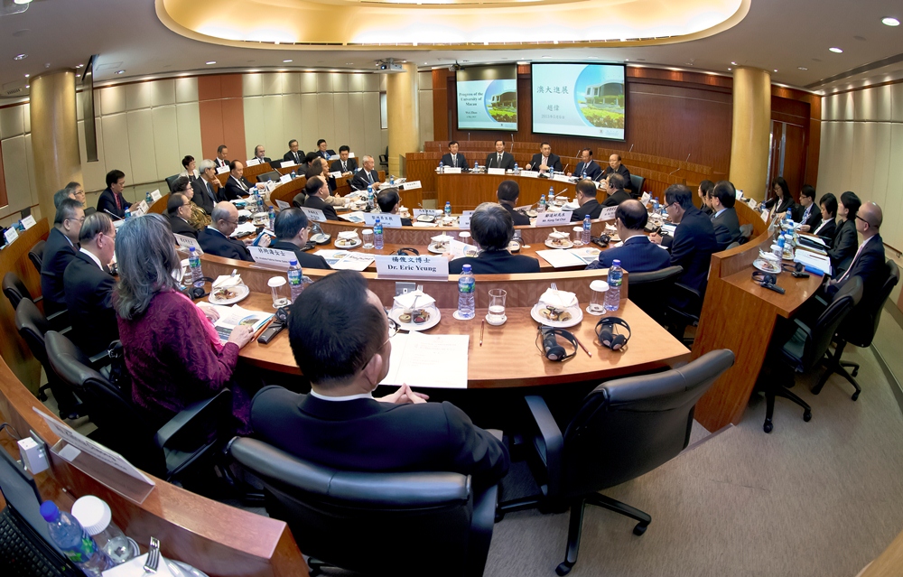 The joint meeting was presided over by Chui Sai On, chancellor of UM and chief executive of Macao. Cheong U, secretary for social affairs and culture of Macao SAR; Tam Chon Weng, chief of the Office of the Chief Executive; as well as UA and UC members, comprised of distinguished community figures, the university’s top management, and alumni and student representatives, attended the meeting to contribute suggestions for the future development of the university. Chui Sai On said at the meeting that the SAR government will continue to provide support to UM. He said he hopes that UM can seize the wonderful opportunity presented by the new campus to highlight the characteristics of Macao’s higher education, to further manifest the advantages of UM and Macao, to improve the comprehensive competitiveness of Macao, and to help Macao develop into a world tourism and leisure centre as well as a service platform for business and trade cooperation between China and Portuguese-speaking countries. He noted that over the past three years the new campus has been constructed at full throttle and now the various construction tasks have been basically completed. After the inspection of the new campus is over, UM will move to the new campus in stages. He remarked that in the future UM should seriously think about how to make full use of the advantages of the new campus to develop into a world-class university with distinctive character so as to nurture more outstanding graduates to contribute to the future development of Macao and China. He promised that the Macao SAR government will adhere to the policy of increasing investment in education and will continue to closely follow the university’s development.