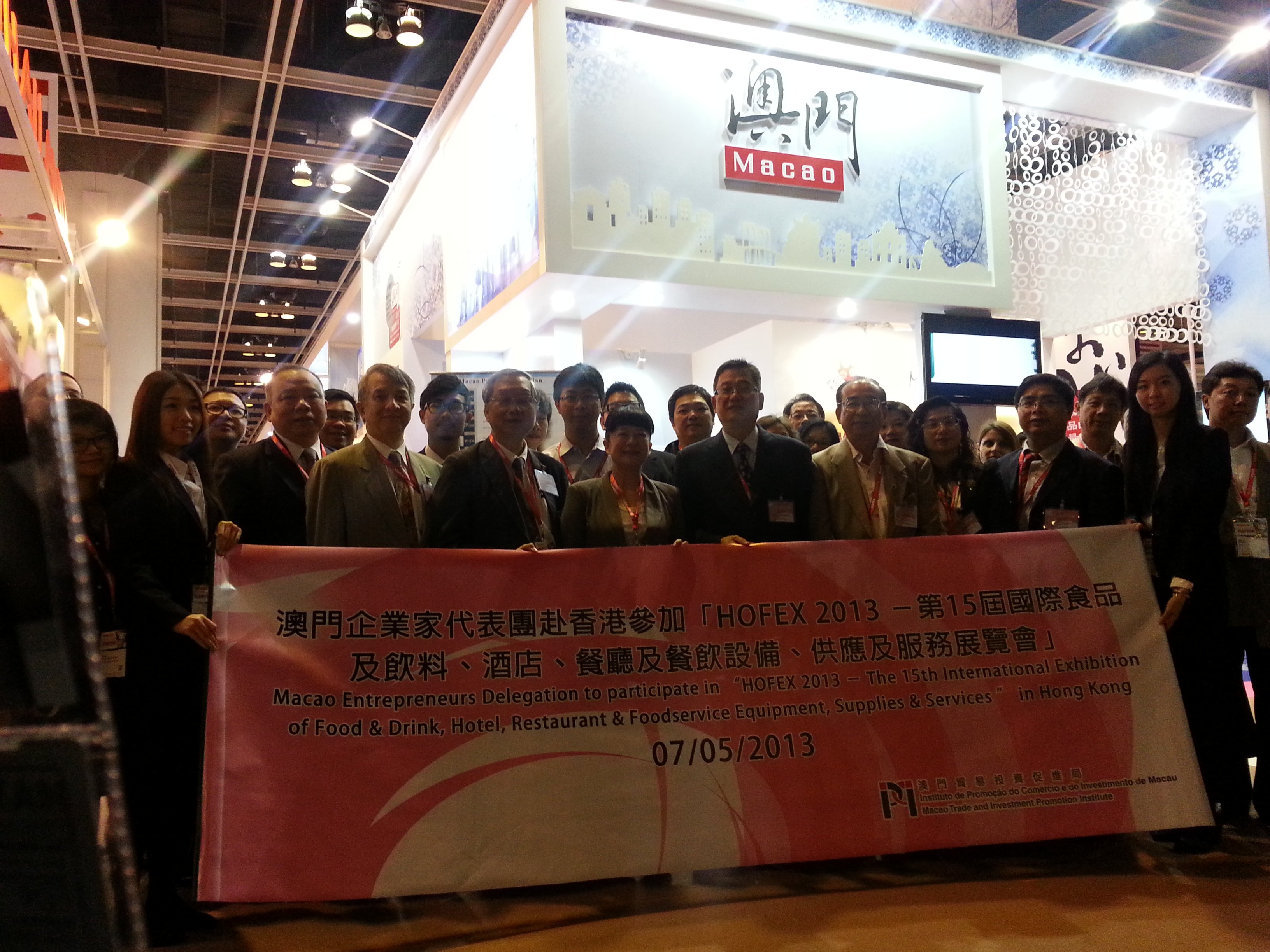 The 46-member Macao Business Delegation attended the opening ceremony of HOFEX 2013. Mrs. Irene V. K. Lau, Executive Director of IPIM, was invited to participate and to preside over the opening ceremony together with such distinguished guests as Prof. Chan Ka-keung, Secretary for Financial Services and the Treasury of Hong Kong SAR Government, Dr. Peter Lam Kin-ngok, Chairman of Hong Kong Tourism Board and Mr. Daniel Cheung, General Manager of Hong Kong Exhibition Services Ltd.