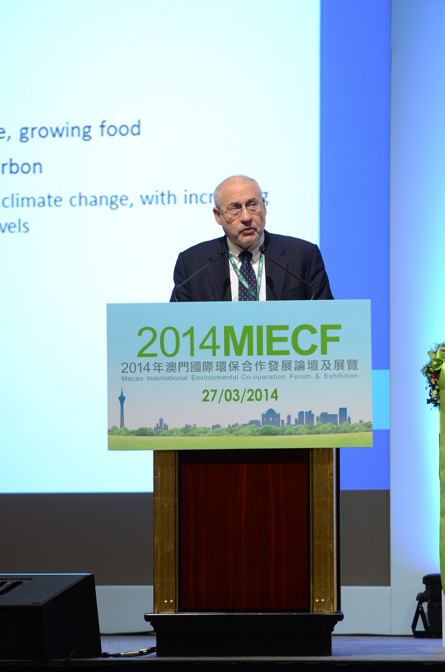 The 2014 Macao International Environmental Co-operation Forum and Exhibition (2014MIECF) have scheduled nine brilliant talks by experts and scholars from around the world, to share their insights on environmental issues. At today´s opening ceremony, Professor Joseph Stiglitz, Recipient of the Nobel Memorial Prize in Economic Sciences, Former Chief Economist of the World Bank, Honorary Doctor of Social Sciences of the University of Macau and Professor of the University of Columbia, gave a keynote speech entitled “A Future of Green Growth: Why Sustainability and Equity are Crucial for Saving the Environment”.