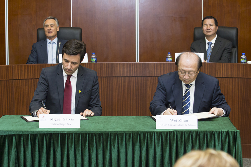 The University of Lisbon and the University of Minho signed two memoranda of understanding (MOUs) on academic collaborations with UM. Rector Wei Zhao, Rector António Cruz SERRA, and Rector António M. CUNHA signed the MOUs on behalf of their respective universities. The signing ceremony was witnessed by Portuguese President Silva, Minister of Defence and Minister of State and Foreign Affairs of Portugal Rui Machete, Minister of Education and Science of Portugal Nuno Crato, Secretary for Social Affairs and Culture of Macao SAR Cheong U, and UM Vice Rector Rui Martins. UM has a long-standing collaboration with the two universities. The signing of the agreements is expected to further strengthen contact and cooperation between faculty members, departments, and research institutions at UM and the two universities. UM and the two universities will carry out collaboration in various forms, including having each other’s staff deliver lectures, hold seminars and discussions, teach courses, and conduct research and supervise students’ studies; having each other’s students attend courses and carry out studies; joint development of teaching programmes; and collaboration of faculty and students in research projects, etc. The main areas of focus will be Portuguese Studies (at the two universities in Portugal), and Chinese and Asiatic Studies (at UM). Additionally, UM’s State Key Laboratory of Quality Research in Chinese Medicine and the Portuguese company Technophage signed a collaboration agreement, signalling the official start of collaboration between the two parties in Chinese medicine.