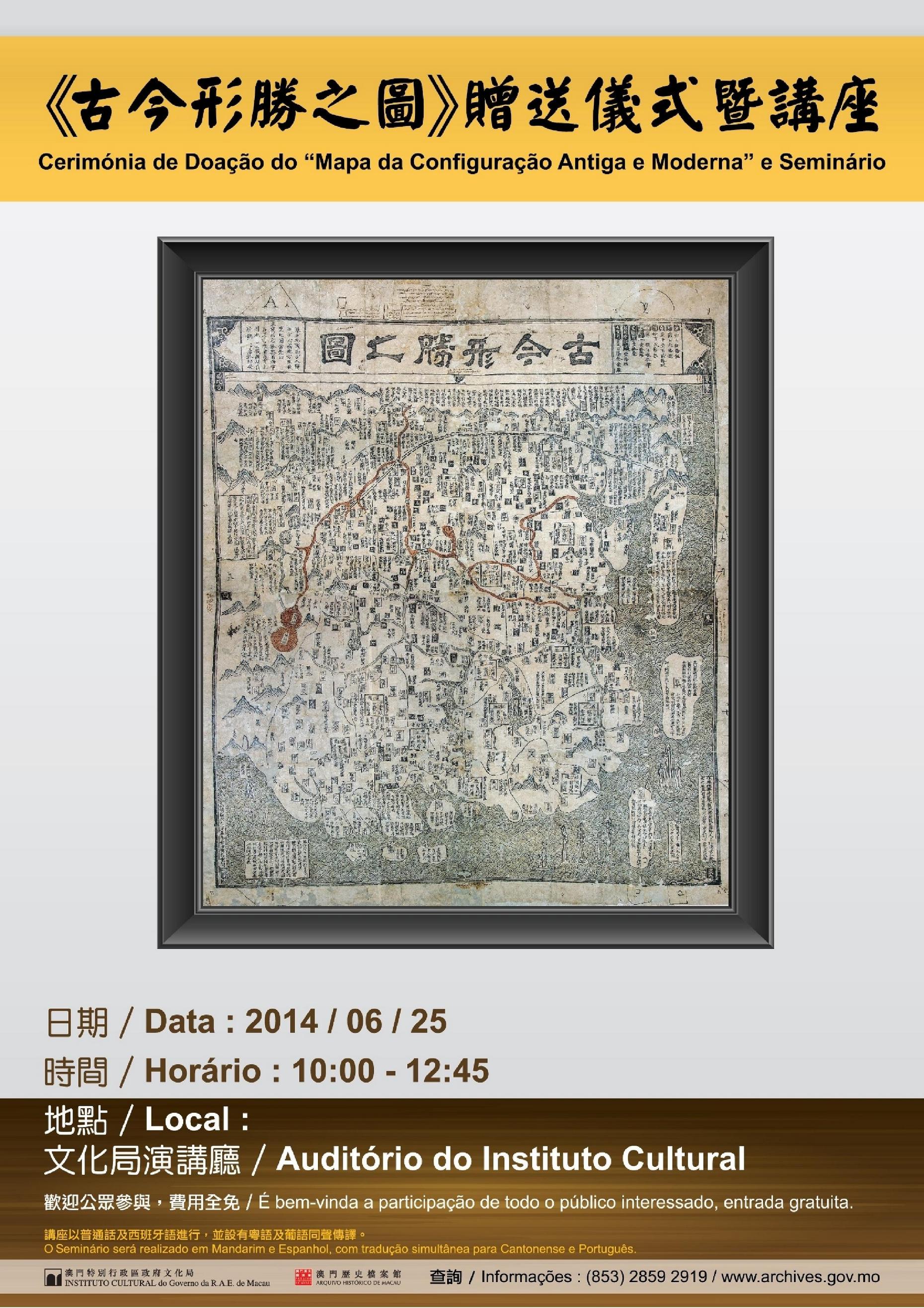A full-scale replica of the precious map Gujin xingsheng zhi tu (Map of advantageous terrain past and present) from Jiajing’s reign (1555), featuring interesting references to the Portuguese presence in Macao, will be donated to the Macao Historical Archive, under the auspices of the Cultural Affairs Bureau, by the Research Center for Social Sciences and Humanities of the National Tsing Hua University in Taiwan, in a public ceremony to be held on 25 June 2014 at 10am at the Cultural Affairs Bureau auditorium.