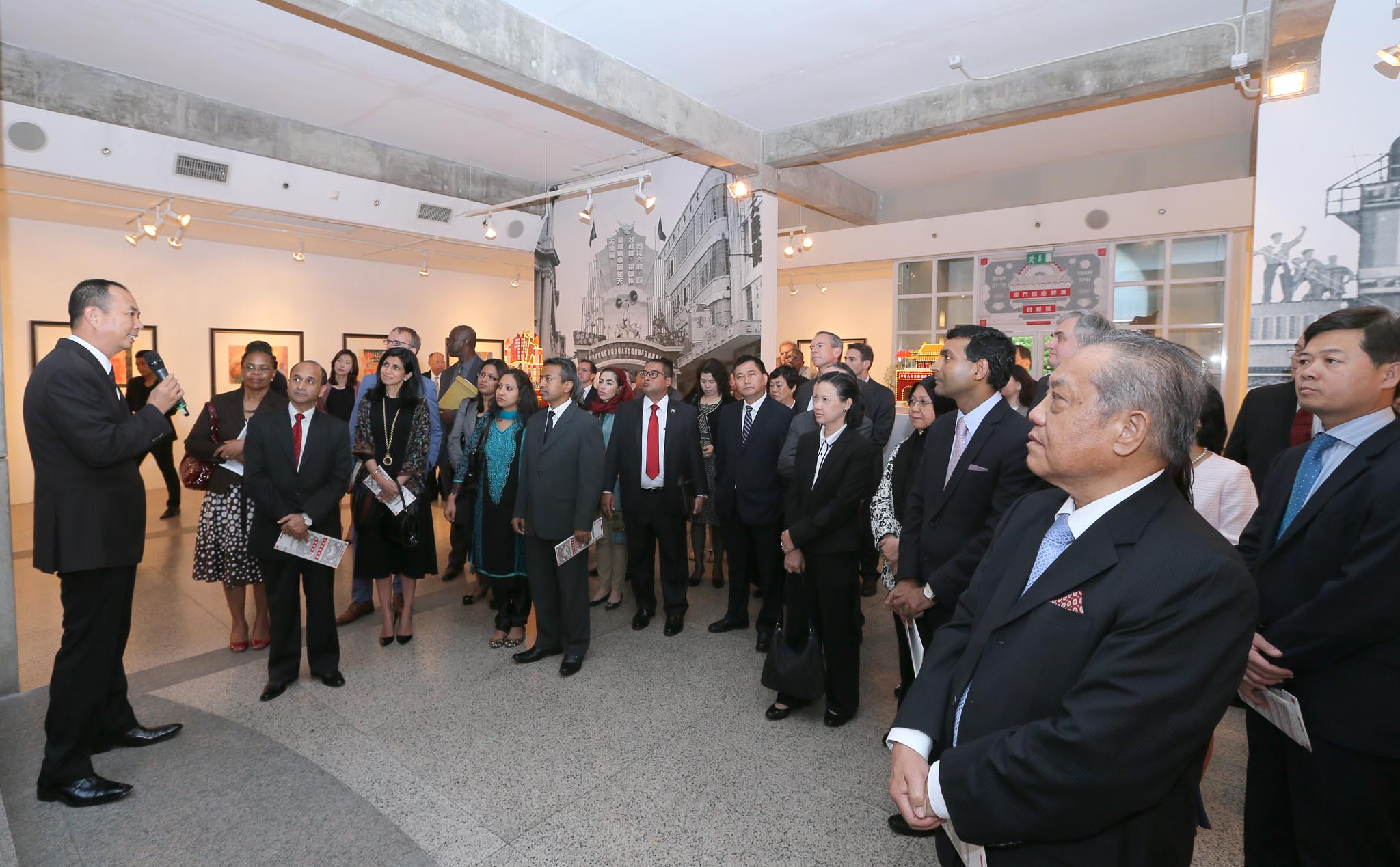 Exhibits include 30 special paintings by National Day pailou old days designers and members of the Macao Artists Society, whilst valuable photos and models of National Day pailou are also displayed. The delegation was interested in the construction of the pailou and appreciated the process of the production crews who built them in one night.
