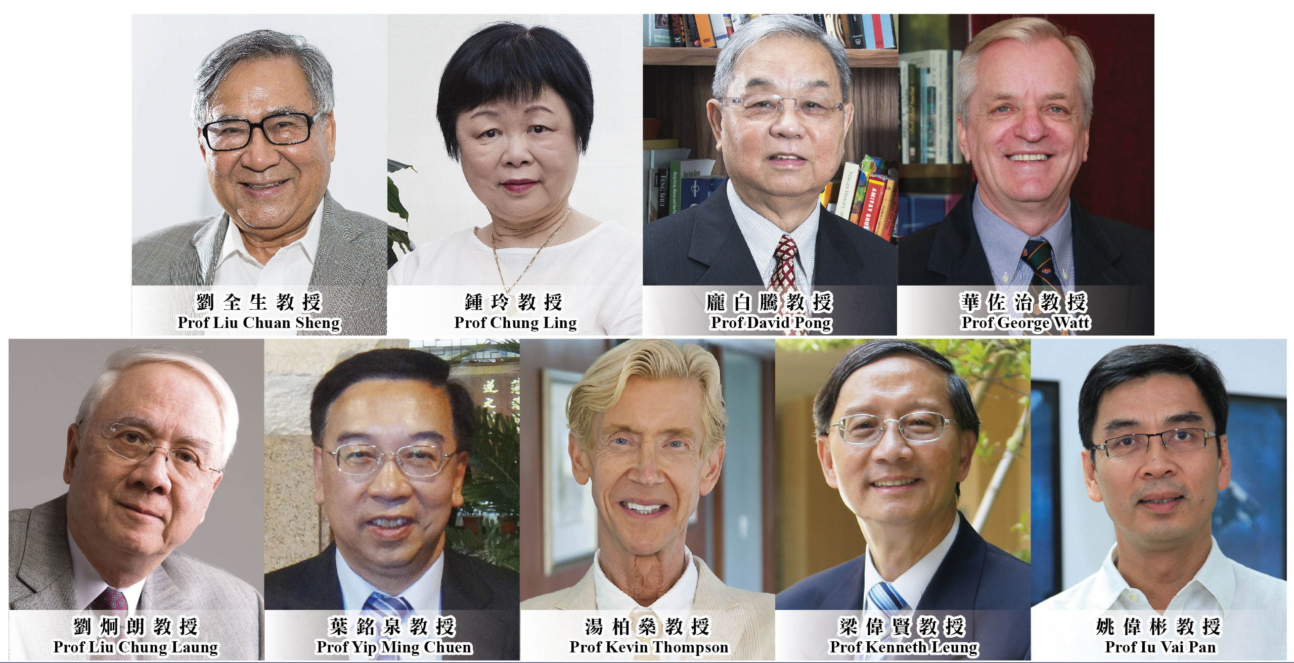 These nine individuals are Prof Liu Chuan Sheng, an authority on plasma astrophysics; Prof Chung Ling, a prolific and significant writer; Prof David Pong, a well-known East Asian historian; Prof George Watt, a literary scholar; Prof Liu Chung Laung, an authority on computing machinery; Prof Yip Ming Chuen, an expert on the mechanics of materials; Prof Kevin Thompson, a renowned musician; Prof Kenneth Leung, a scholar of communication law and ethics; and Prof Iu Vai Pun, an expert in structural mechanics.
