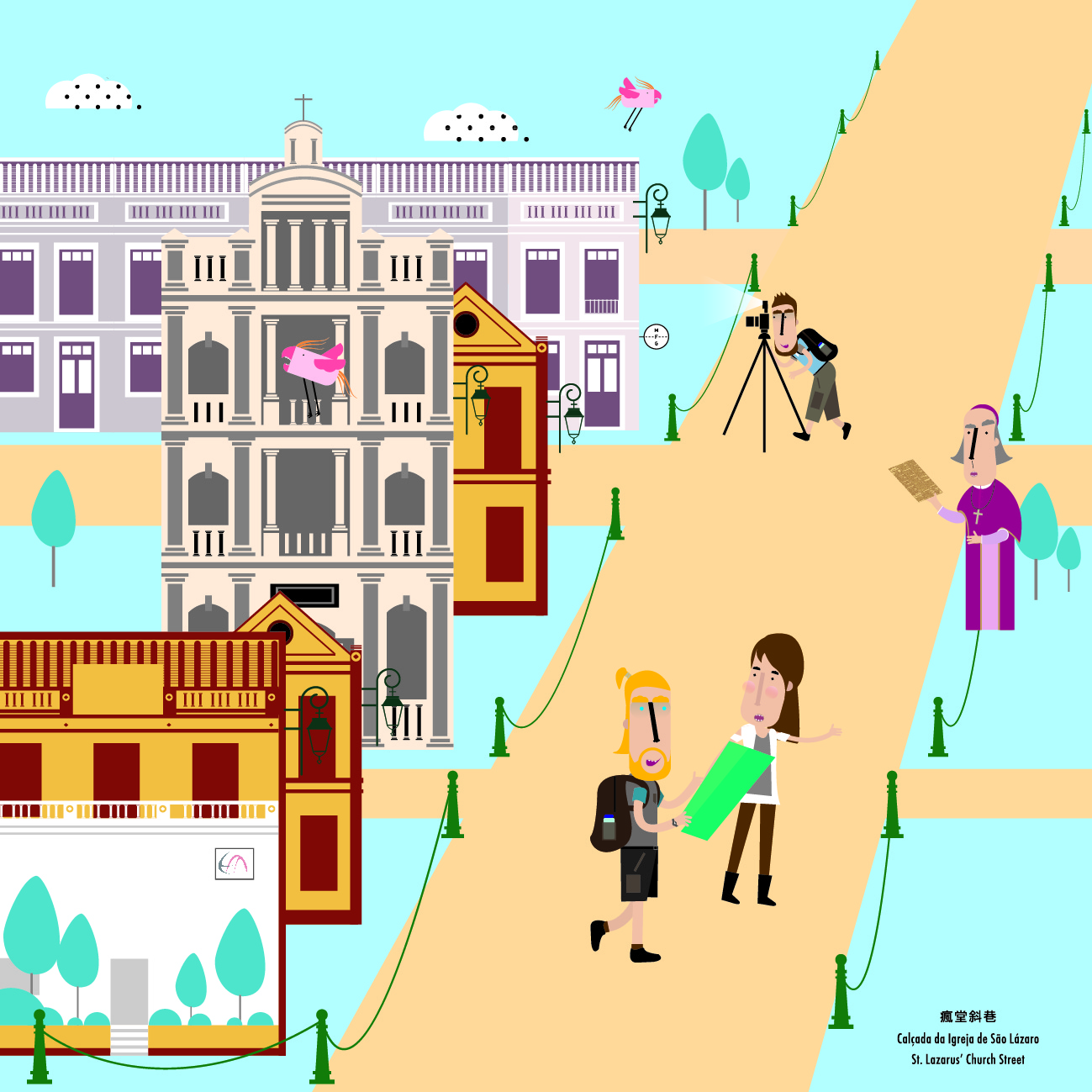 St. Lazarus’ Quarter is a classified architecture group. There used to be a leprosarium in this Quarter and so it is also known as the “Leprosy Quarter”. Surrounded by a uniform group of Southern European style two-storey buildings, the Quarter is full of Southern European style and also rich in history and culture. It has also become in recent years an important incubator area of local cultural and creative industries, in addition to hosting annually the “Parade through Macao, Latin City”. In this event, artists from Macao and Latin languages countries sing and dance through the neighbourhood’s streets, rich in Latin style, revealing the unique cultural characteristics of Macao as well as its atmosphere of cultural fusion, creating beautiful scenery year after year. The calendar incorporates the characteristic surrounding streets and buildings located in this Quarter into its design, including St. Lazarus’ Church, St. Lazarus’ Church Street, 10 Fantasia – A Creative Industries Incubator, Albergue of the Macao Holy House of Mercy, just to name a few. It also features interesting characters along with descriptions on the attractions, promoting the historical background of St. Lazarus’ Quarter and also the development of cultural and creative industries in the region.