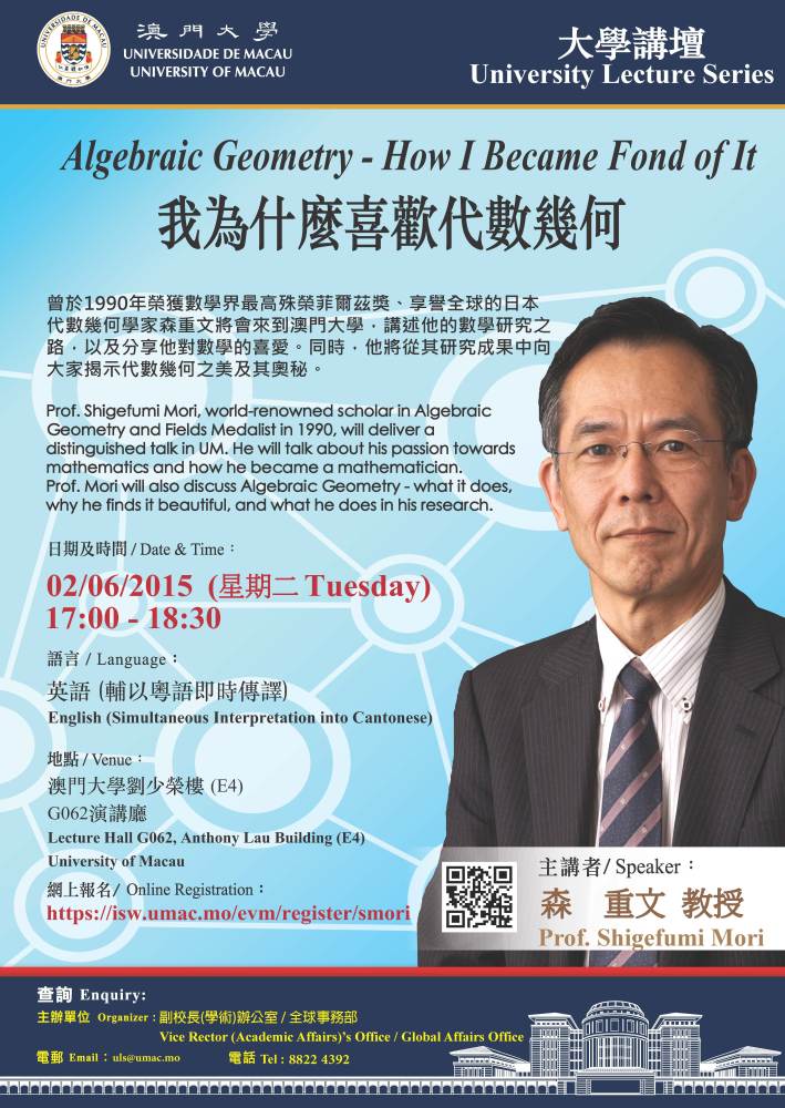 Prof Shigefumi Mori, a world-renowned mathematician and recipient of the Fields Medal in 1990, will give the first lecture of the University Lecture Series, titled ‘Algebraic Geometry – How I Became Fond of It’, at the University of Macau (UM) on 2 June. He will talk about his passion for mathematics and the beauty of algebraic geometry.