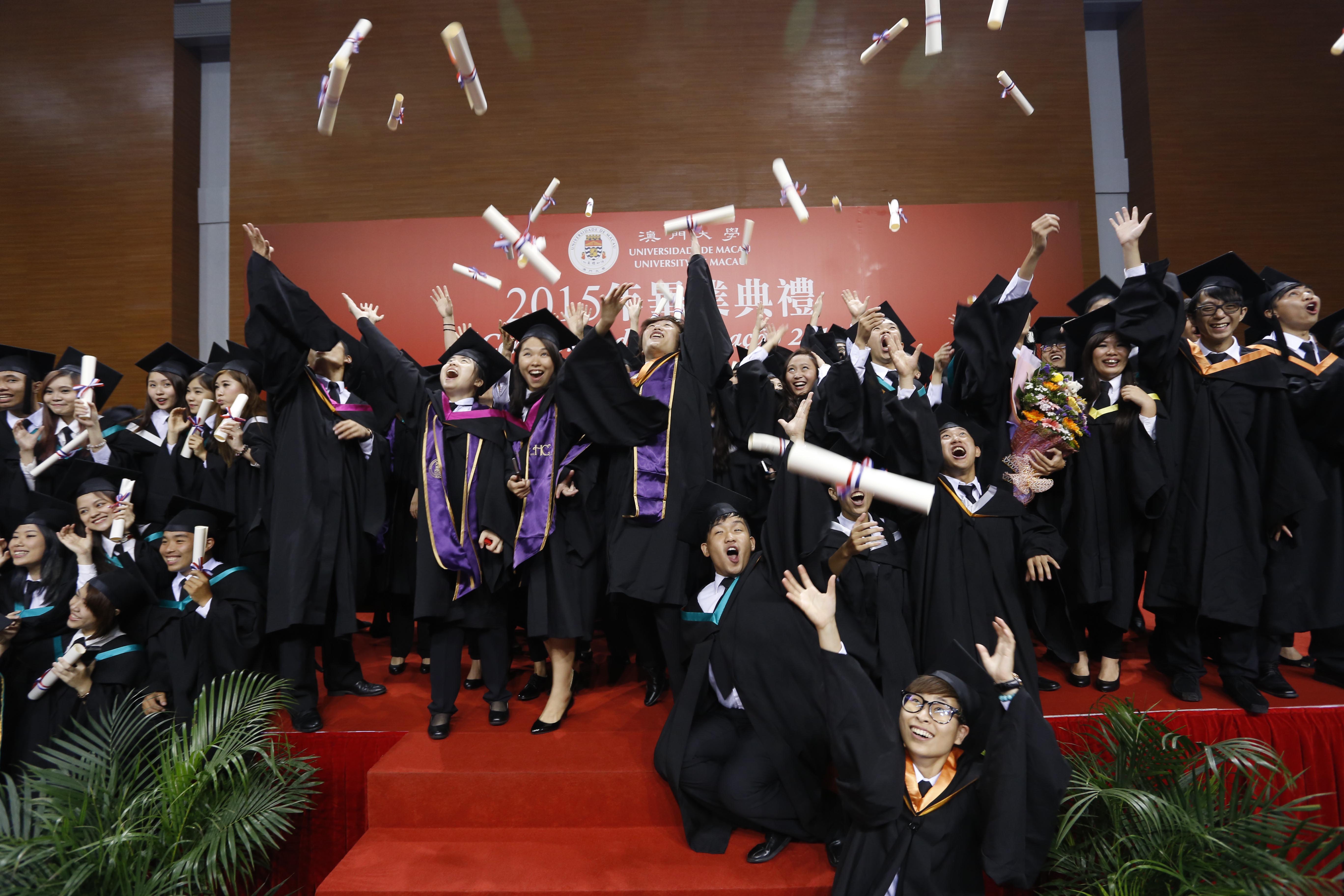 The University of Macau (UM) held the Congregation 2015 in its Sports Complex today (30 May) to present certificates to more than 1,000 graduating students. Chui Sai On, chief executive of the Macao SAR and chancellor of UM, noted at the ceremony that UM’s increasing international influence plays a positive role in promoting Macao’s image internationally, and he believes that UM will continue to occupy an important position on the higher education scene in Macao and make significant contributions to improving the overall quality of higher education in Macao.