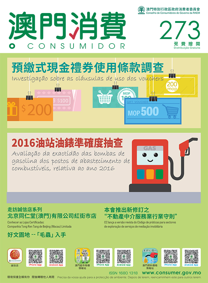 Consumer Report is now available free of charge at the Council (Av. Horta e Costa, N.º 24-A, Edf. Cheung Heng, R/C), and the service counter of the Council at Macao SAR Government Service Centre (Rua Nova da Areia Preta, Nº52), Public Information Centre at Vicky Plaza, libraries and bookstores. Consumers may also access the magazine online on the Council’s official website (http://www.consumer.gov.mo) and WeChat official account.