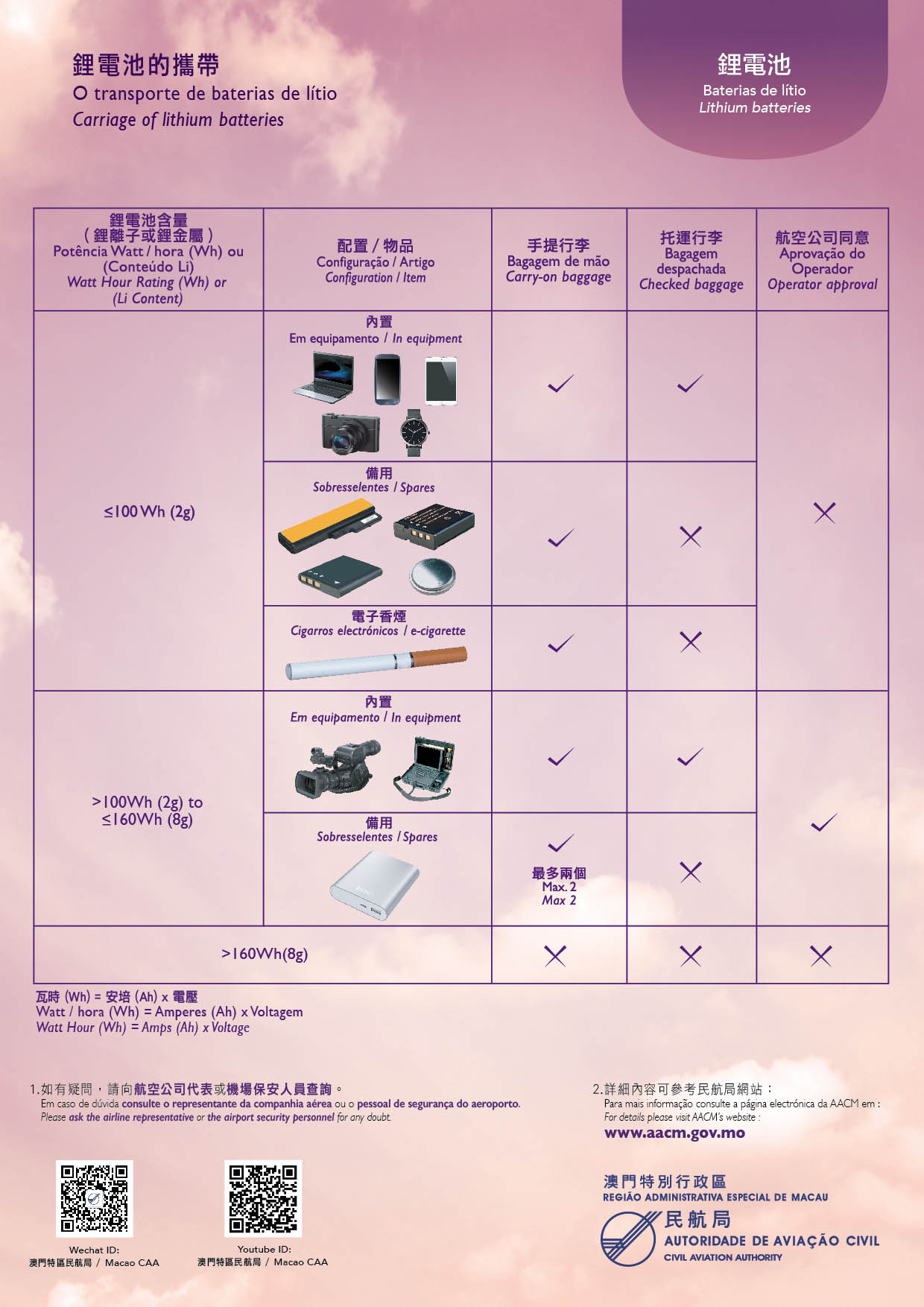 The publicity materials for the security-control items and the dangerous goods at Macau International Airport comprise of three major subjects: 1) the requirements of the carriage of liquids, aerosols and gels, 2) the types of restricted articles and 3) the types of dangerous goods (including the requirements of the carriage of lithium batteries). The information of these subjects is published in printed posters and broadcasted in a video, which are put in the baggage screening area, the check-in counters, the passenger screening area and the boarding gates on the departures level, as well as in the transit corridor and the express link area. The electronic screens at the check-in counters and the passenger screening area are newly adopted for this purpose. The video has been broadcasted in the electronic screens in these areas since mid-December 2016.
