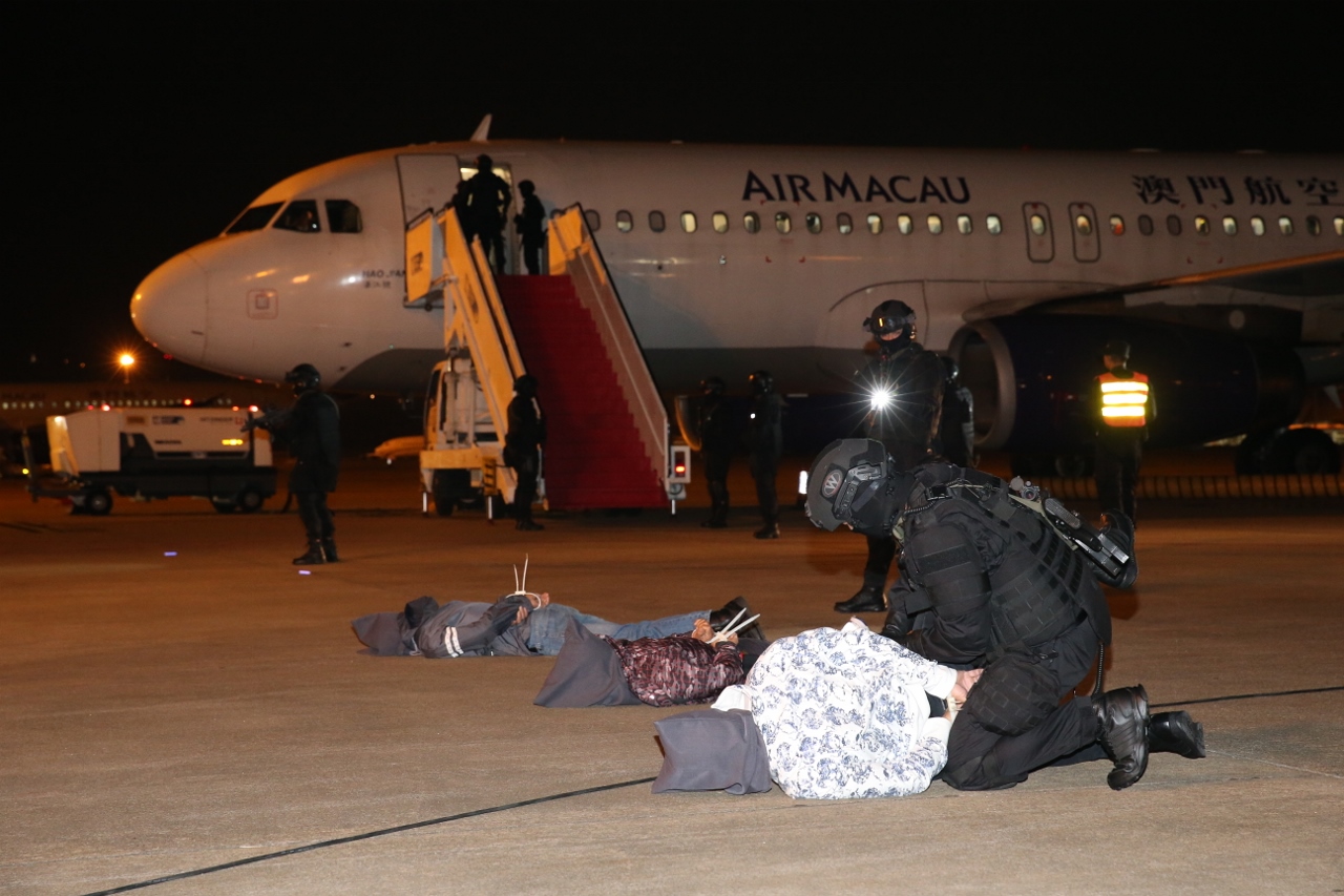 The exercise on unlawful seizure of aircraft, which is held once every two years, was conducted in Macau International Airport early this morning (20 October 2017). It simulated the scenario of a foreign aircraft being unlawfully seized by a political organization of that country. The hijackers demanded the Macao SAR government to impose pressure on the government of their country to release the imprisoned organization members. Macau International Airport immediately activated the emergency plan to resolve the crisis. All passengers and crew members were eventually rescued. The exercise was smooth and deemed to have reached its goal.