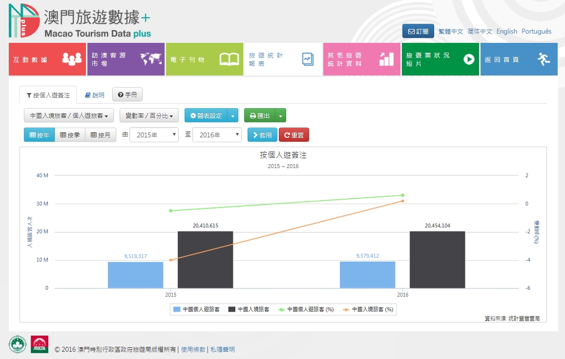 In the days ahead, MGTO will press on to optimize different features of the “MTD plus” by taking opinions of users and industry operators into consideration, so that users will find it an expedient tool for search of local tourism figures with its enhanced convenience. All users from various sectors are welcome to access the website of “MTD plus”: http://dataplus.macaotourism.gov.mo/?lang=E