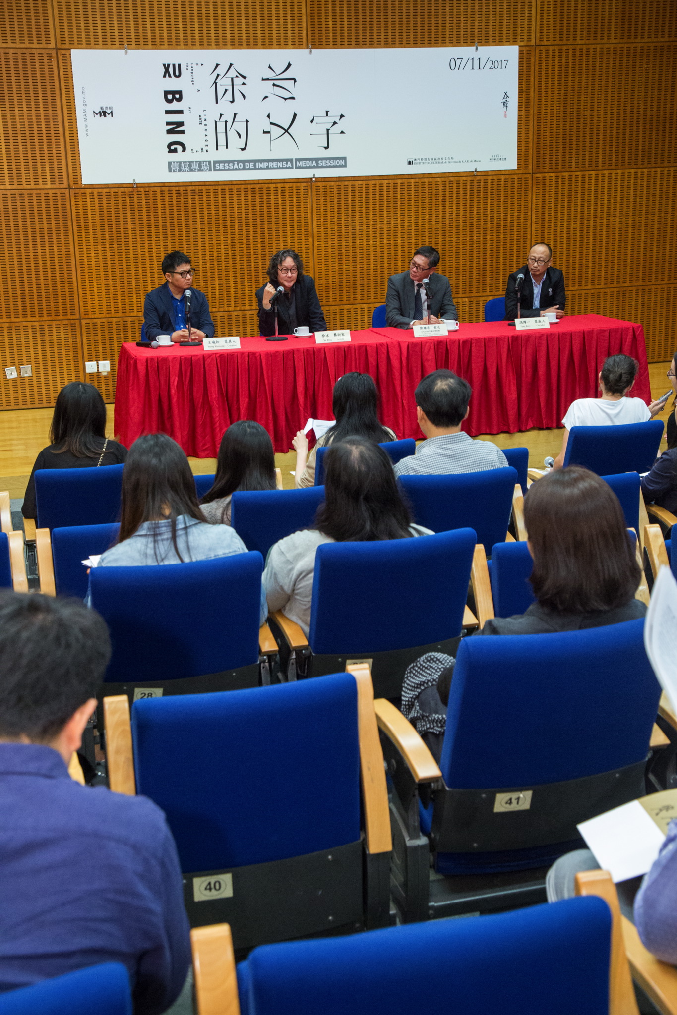 The “Language & the Art of Xu Bing - Media Session” was held on 7 November, at 4pm, in the Museum Auditorium located on the first floor of MAM, and was attended by the Director of the Macao Museum of Art, Chan Kai Chon; the artist Xu Bing; and the curators Feng Boyi and Wang Xiaosong, among others. In this session, the artist and curators introduced the preparatory process of the exhibition and the highlights of exhibits to the media.