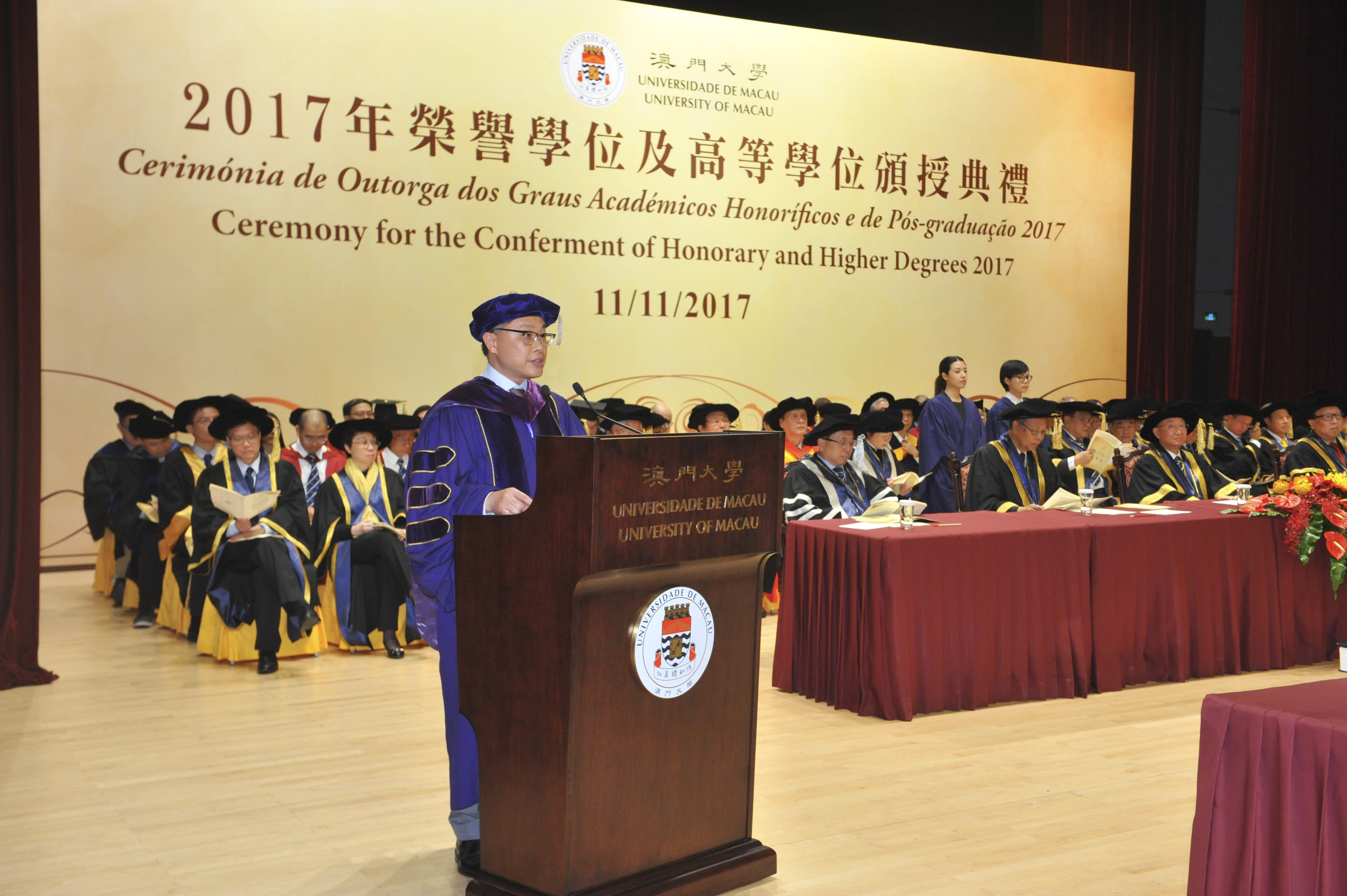 The University of Macau (UM) today (11 November) held the Ceremony for the Conferment of Honorary and Higher Degrees 2017. During the ceremony, the university conferred honorary doctorates on Academician He Jingtang, a representative figure in the Chinese school of architecture; Professor Henry T. Yang, a world-renowned expert in structural engineering; and Professor Binglin Zhong, a well-known educationalist, in recognition of their outstanding achievements and significant contributions to society and education.
