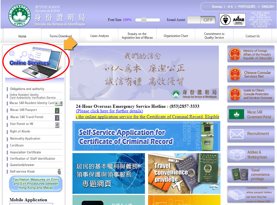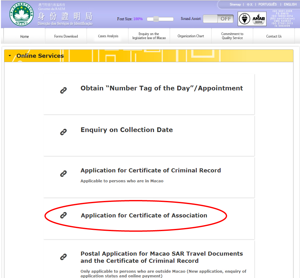 After downloading the mobile application, applicants can go to the “Online Services” zone of DSI’s website and click the “Application for Certificate of Association” button to enter the system to lodge the application. Firstly, applicants need to confirm their email address, and then follow the system instructions to operate and input data. After that, they have to use the mobile application to provide the image of the front side of their identity card and their signature. Lastly, applicants have to pay online, download and print the application receipt to finish the application procedures. Applicants can visit DSI’s website (www.dsi.gov.mo/video/assoOnline.mp4) for watching the demonstration video of the above-mentioned service.
