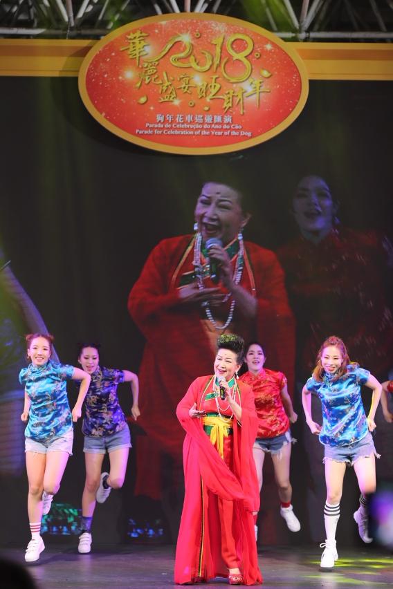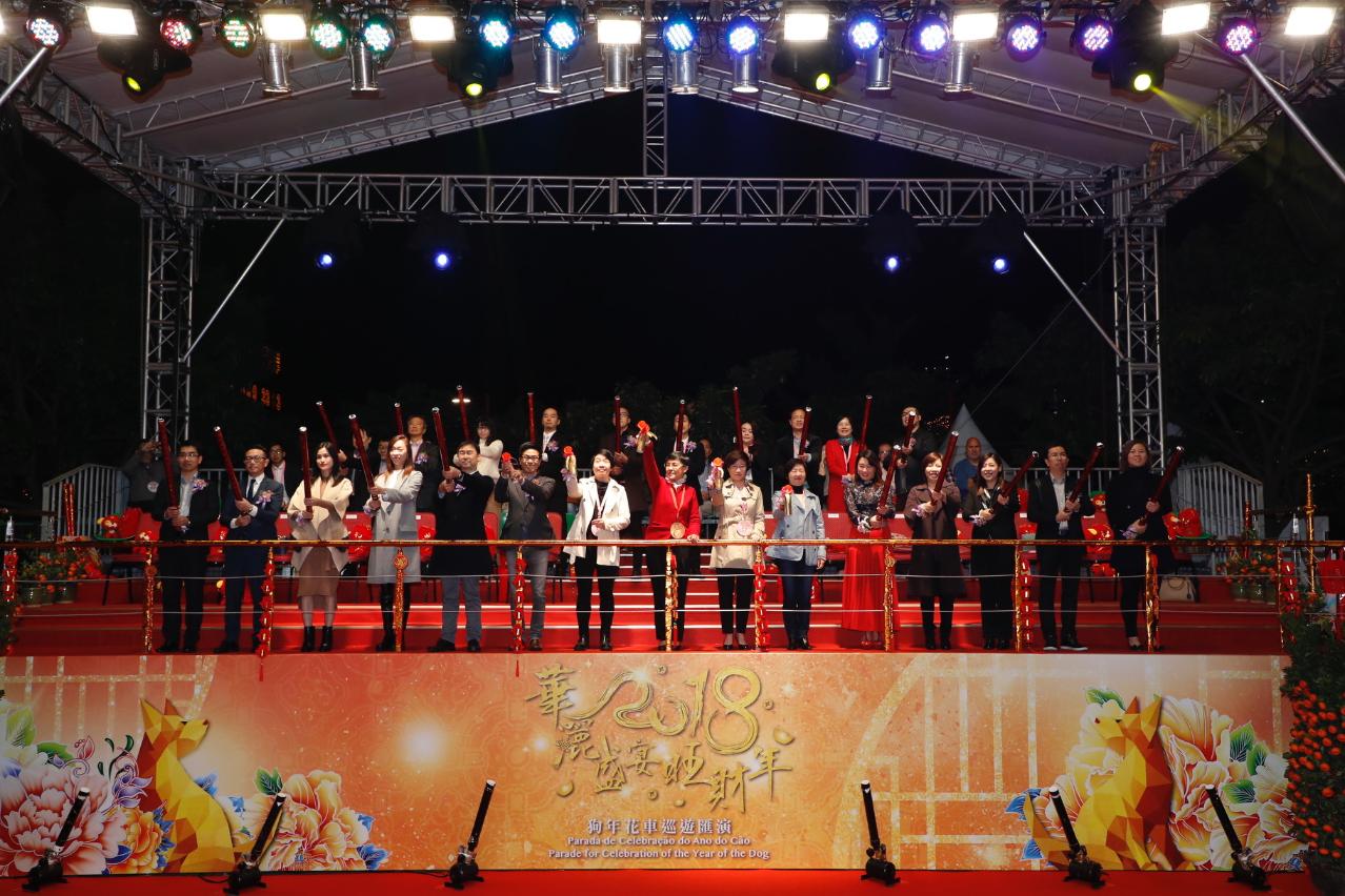 Organized by the Macao Government Tourism Office (MGTO), the “Parade for Celebration of the Year of the Dog” was held at the Northern District tonight (24 February) to celebrate the joy of Lunar New Year with all. A large number of residents and visitors flocked to enjoy the float parade along the route and the stage performances at Iao Hon Market Garden. MGTO Director Maria Helena de Senna Fernandes, Deputy Director Cheng Wai Tong, Vice President of Cultural Affairs Bureau, Leong Wai Man, Vice President of Sports Bureau, Lam Lin Kio, Head of Department of Civic Affairs and Consultation of Civic and Municipal Affairs Bureau, Patsy Ko Pui San, and other guests officiated the kick-off ceremony for the Parade at Rua Norte do Patane at 8 p.m.
