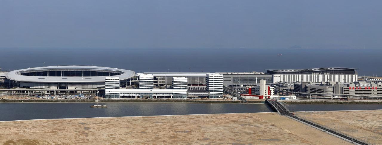 In preparation for the launch of the Bridge, which spans the Pearl River Delta, installation of equipment is in progress at the customs clearance building and the vehicle clearance facilities.