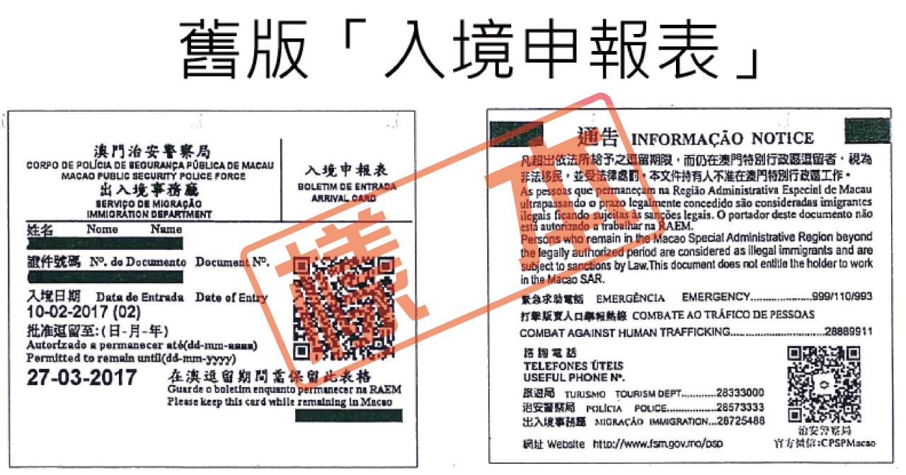 Non-residents holding the old version of Arrival Card issued on or before 31 March 2018 may remain in Macao until the limit of stay specified on the Card.