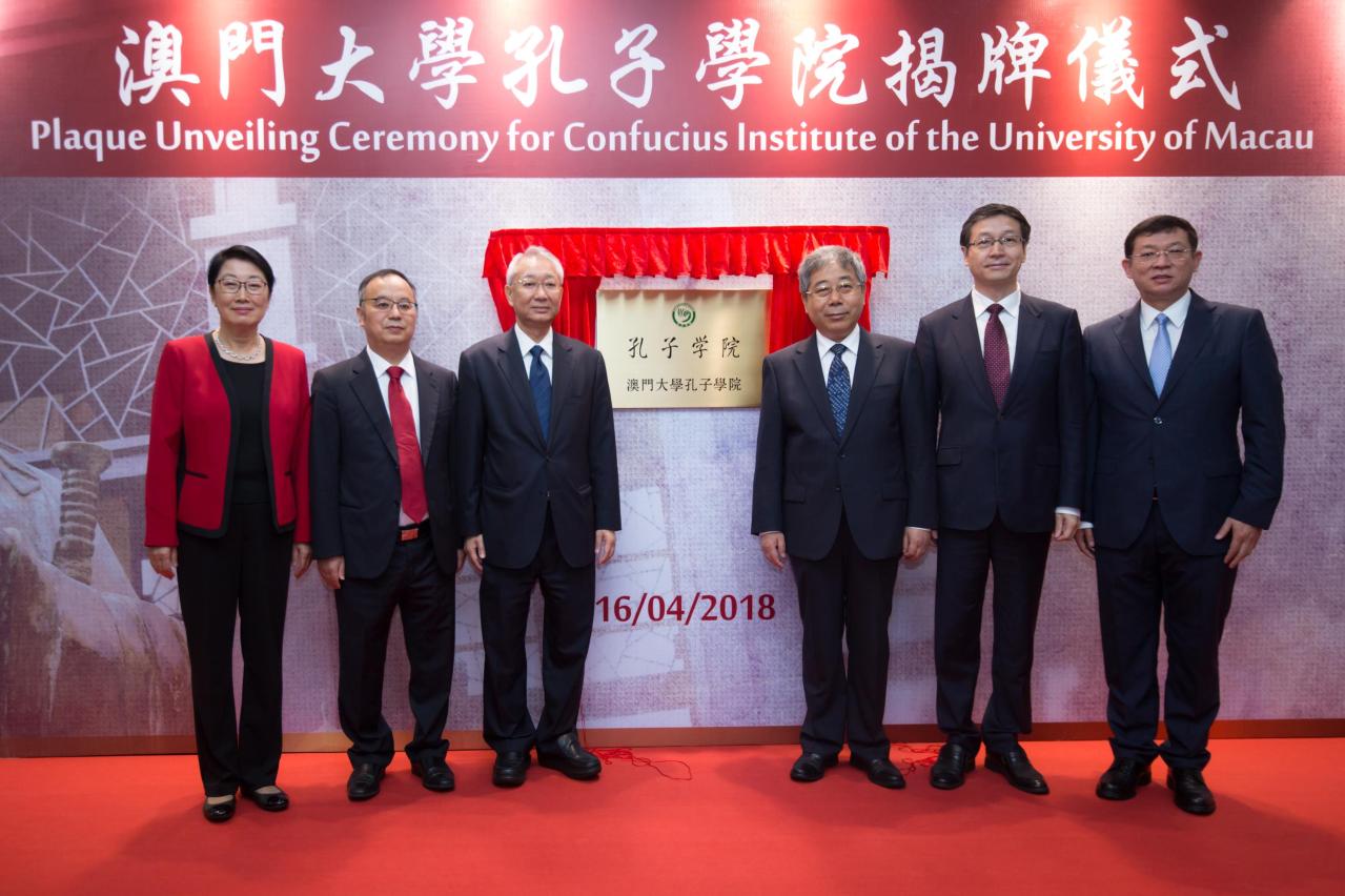 After the ceremony, Chen Baosheng; Sun Da; Lam Kam Seng; Yonghua Song; Ma Jianfei, party secretary and deputy director-general of the Confucius Institute headquarters and deputy director of the Office of Chinese Language Council International; and Hong Gang Jin, dean of the Faculty of Arts and Humanities at UM officiated at the unveiling ceremony for the Confucius Institute at UM. The Confucius Institute at UM has the unique advantage of being located in a multilingual and multicultural society that is a special administrative region to which a special political system applies. The institute will make full use of this advantage to pursue international collaboration, especially with Portuguese-speaking countries, in Chinese language teaching, learning, and teacher training, as well as to establish a communication platform to promote such collaboration. The delegation from the Ministry of Education also visited Ma Man Kei and Lo Pak Sam College.