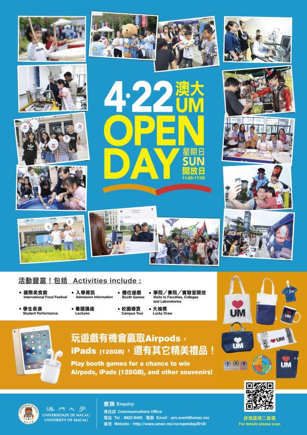 Participants will have the chance to win an iPad after collecting all the required stamps or win a set of AirPods after completing the ‘Ten-Day Challenge’ on UM’s official Facebook page. Those who have uploaded photos of the Open Day to their WeChat or Facebook page can also claim small gifts at the game booth. There are many more surprises for you to discover on the Open Day.