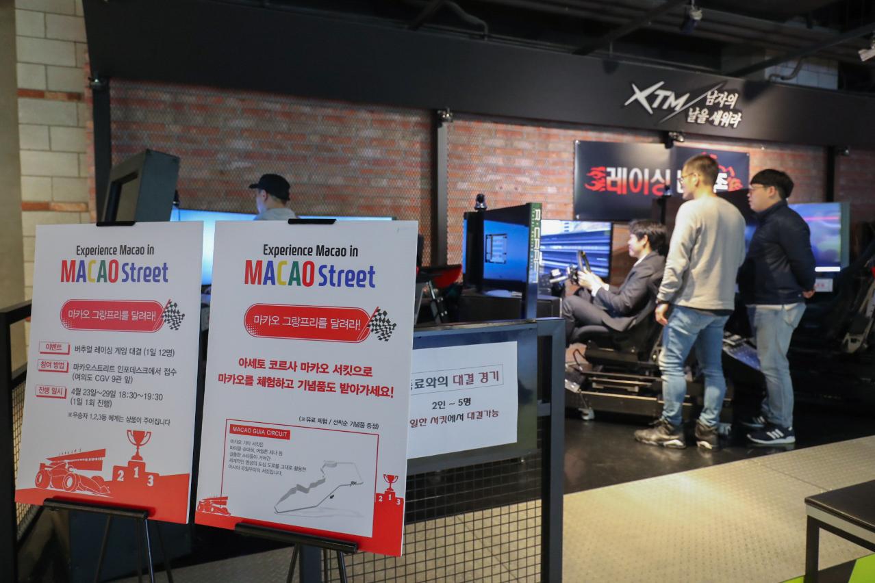 The “Macao Street” features a “Macao Screen Box” at the gate of one of the theaters at CGV, equipped with Screen-X, inviting moviegoers to experience Macao, with special emphasis on the recent designation as a UNESCO Creative City of Gastronomy. Right in front, a “Macao Café” displays the city’s major attractions and an information desk. An International Film Festival & Awards‧Macao image wall and photo taking zone is also a main attraction of the “Macao Street”. Another special feature is the Macau Grand Prix (MGP), with a mini MGP organized daily on race simulators, with awards and podium for the winners, among other activities.