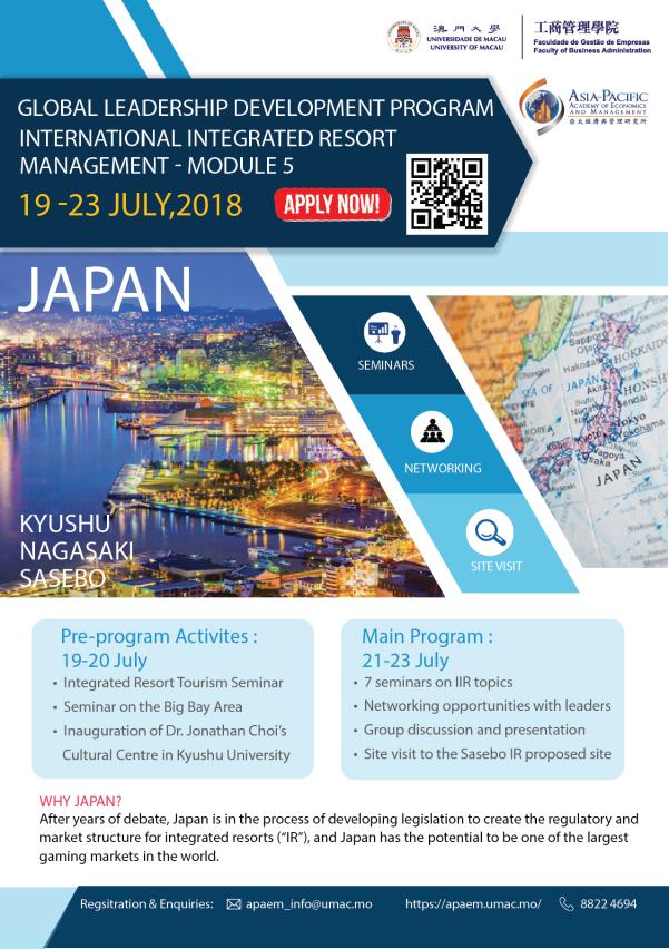 Enrollment is now open for the fifth module of the Global Leadership Development Programme Series: International Integrated Resort Management, which is jointly organised by the University of Macau’s (UM) Asia-Pacific Academy of Economics and Management (APAEM) and Faculty of Business Administration (FBA). The programme will take place in Kyushu and Nagasaki, Japan, from 21 July to 23 July. Scholars and industry experts from Macao and Japan will give lectures and exchange ideas with the participants during the programme. Industry practitioners are welcome to enroll for the programme.
