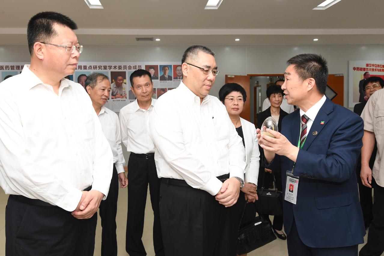 The Mayor of Zhongshan, Mr Jiao Lansheng, accompanied the Chief Executive, the delegation members and representative members of the “Thousand Talents Union” during the visit to Zhongzhi Pharmaceutical Group. The visitors were briefed by the company’s General Manager, Mr Cheng Jinle, about the group's present situation and development plans. The President of Macau University of Science and Technology (MUST), Professor Liu Liang, attended the event, and reported on the work of the State Key Laboratory of Quality Research in Chinese Medicine, which was jointly established by MUST and Zhongzhi Pharmaceutical Group.