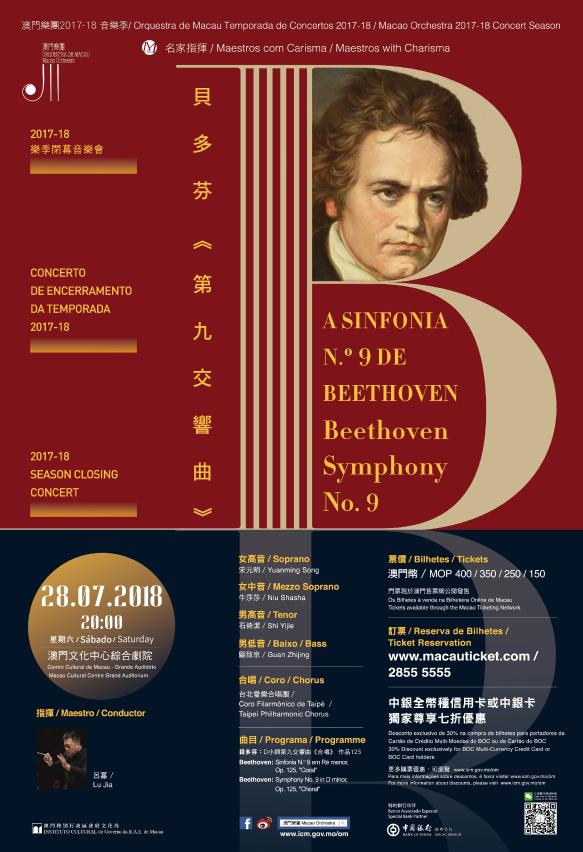 Tickets for OM’s 2017-18 Concert Season Closing Concert - Beethoven Symphony No. 9 are priced at MOP 400, MOP 350, MOP 250 and MOP 150. Holders of BOC Multi-Currency Credit Card or BOC Card can enjoy an exclusive 30% discount on their purchases. Ticket hotline is 28555555. For details and enquiries, please call OM at 28 530782 during office hours or visit OM’s website at www.icm.gov.mo/om.