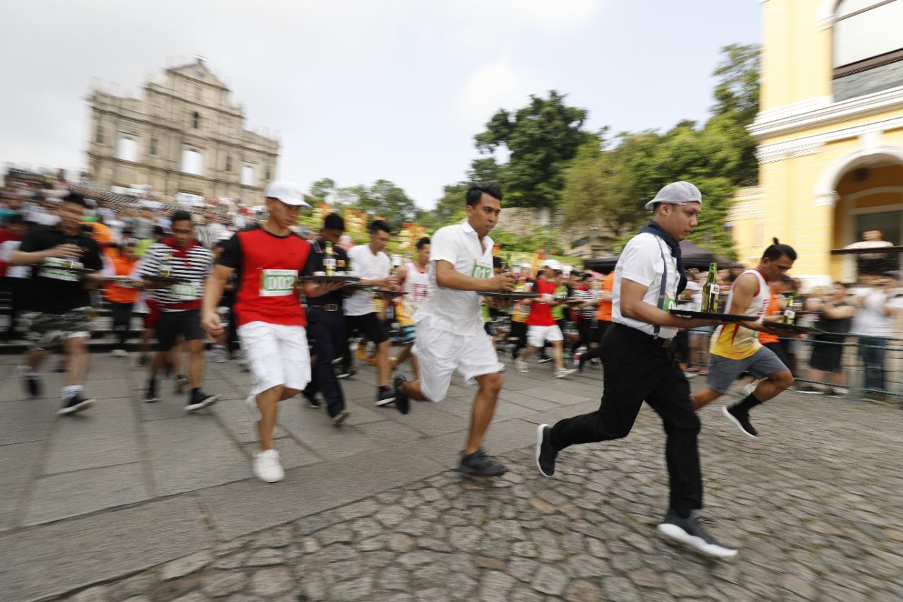 Held annually for frontline workers in the industry, the traditional Tray Race kicked-off in the afternoon. From the Ruins of St. Paul's, contestants ran down the lanes amidst the Historic Centre of Macao until hitting the finish line at Senado Square. The Race was animated with fun and excitement, enticing lots of visitors to take pictures and cheer the runners on.