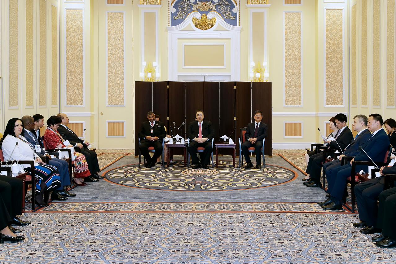 Other officials joining the meeting included representatives respectively from Jiangsu Province; the State Ethnic Affairs Commission; the China Council for the Promotion of International Trade; the Government of the Republic of the Union of Myanmar; the Consulate General of Myanmar in Hong Kong; and the Consulate General of Portugal in Macao and Hong Kong; and ambassadors to China from respectively, Angola, Cabo Verde, Guinea-Bissau, Mozambique, São Tomé and Príncipe, and Timor-Leste.