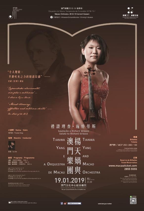 The Macao Orchestra (OM, from the Portuguese acronym), under the auspices of the Cultural Affairs Bureau, presents the concert “Salute to Richard Strauss – Tianwa Yang and the Macao Orchestra” on 19 January 2019 (Saturday), at 8pm, at the Macao Cultural Centre Grand Auditorium. Tickets are now available at the Macao Ticketing Network. Under the baton of the Principal Conductor, Lu Jia, talented violinist Tianwa Yang will cooperate with the Macao Orchestra for the first time. Tianwa Yang began studying violin at the age of four and won gold prizes at various competitions in China at the age of five. At the age of eleven she was invited to perform with various philharmonic orchestras at home and abroad and was awarded the title “Star of Tomorrow” by Seiji Ozawa. She broke the world record at the age of thirteen when she became the youngest performer in the history of music to record Paganini’s 24 Caprices. In addition, Tianwa Yang was hailed by the media in the United States and Europe as “an unquestioned master of the violin” and “the most important violinist to come on the scene in many a year”. She has performed with many internationally renowned orchestras, including the Detroit Symphony Orchestra (United States), Vancouver Symphony Orchestra (Canada), Royal Philharmonic Orchestra (United Kingdom), Deutsches Symphonie-Orchester Berlin (Germany) and the China National Centre for the Performing Arts Orchestra (China).