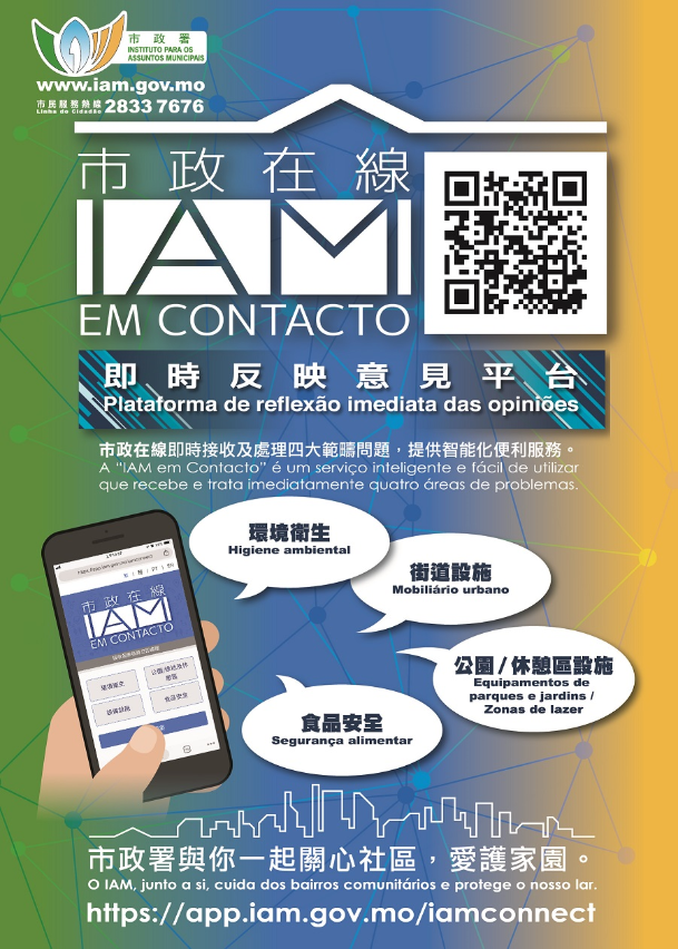 To facilitate the electronic governance of the Macao SAR Government and promote electronic municipal services, the Municipal Affairs Bureau (IAM) launches the “IAM connect” platform for immediate reflection of views on its establishment day (January 1). Residents can access the platform via mobile phones to easily and promptly give their opinions about four municipal areas, namely “environmental hygiene”, “parks and gardens/green areas and leisure areas”, “equipment and facilities” and “food safety”, while they can also log in to the platform anytime to enquire about case progress and the result of follow-up.