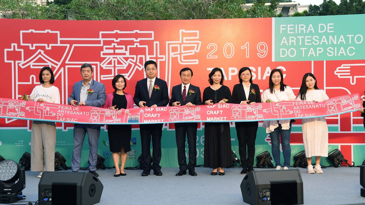 The opening ceremony of the “Tap Siac Craft Market” was held on 26 April at 6:15pm at Tap Siac Square and was officiated by the Secretary for Social Affairs and Culture of the Macao SAR Government, Alexis Tam Chon Weng; the Director of the Department of Publicity and Culture of the Liaison Office of the Central People’s Government in the Macao SAR, Wan Sucheng; the President of the Cultural Affairs Bureau, Mok Ian Ian; the Vice President of the Committee of Cultural Industries, Hsu Hsiu-Chu; the Member of the Administrative Committee of the Cultural Industries Fund, Chu Miu Lai; the Chief of the Division of Cultural, Recreational and Association Affairs of the Department of Cultural and Recreational Affairs and Civic Education of the Municipal Affairs Bureau, Au Chan Weng; the Supervisor of the Boys’ & Girls’ Clubs Association of Hong Kong, Wong Mei Ling; the Founder of CAMPOBAG in Taiwan, Chen Jing Ting; and the Project Manager of The Life Guangzhou, Sarah Nie.