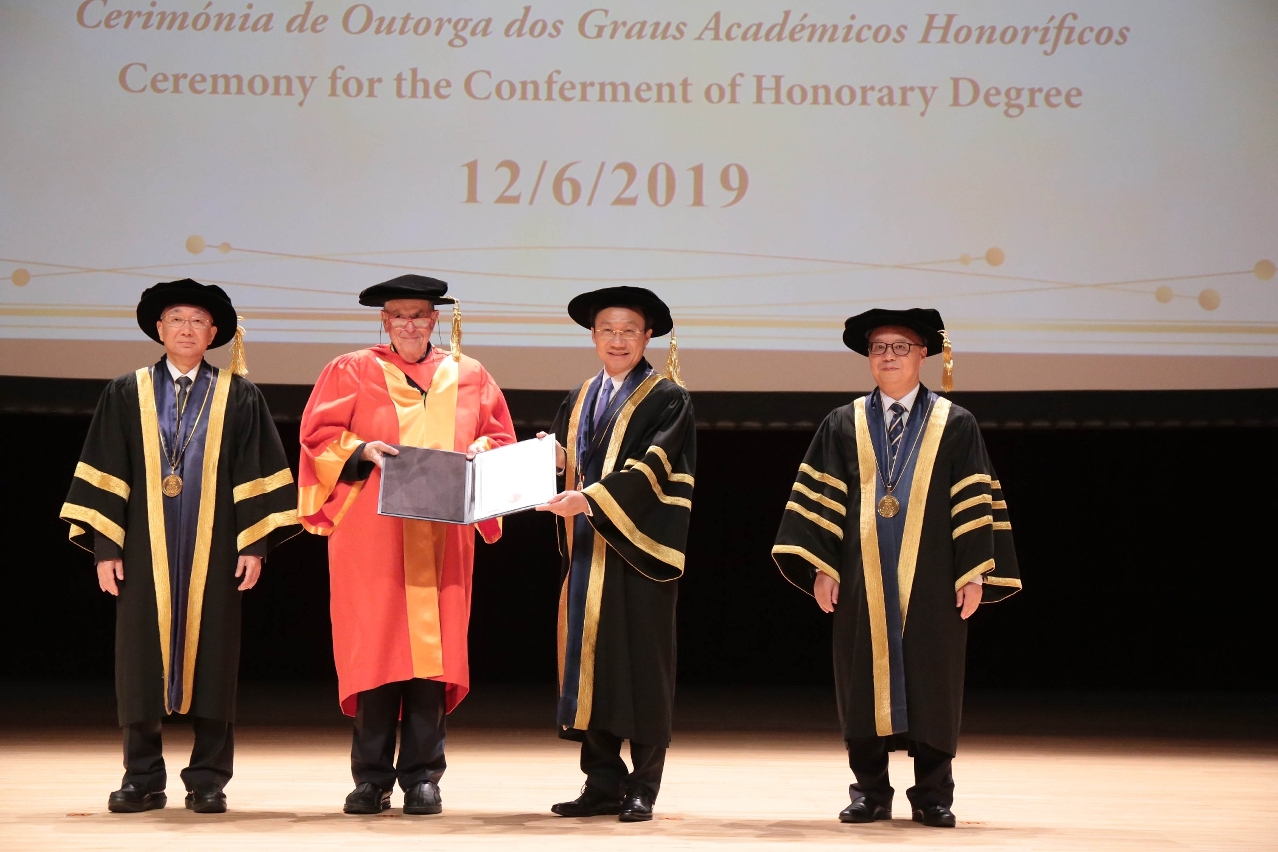 The honorary degree was presented to Prof Ciechanover by Secretary for Social Affairs and Culture Tam Chon Weng in the company of UM University Council Chair Lam Kam Seng and UM Rector Yonghua Song. In delivering the citation for Prof Ciechanover, Faculty of Health Sciences Dean Prof Chuxia Deng said that Prof Ciechanover, who was born in Haifa, Israel, is a world-renowned biochemist. At that time, the scientific community in general did not see the need for an in-depth study of protein degradation, but Prof Ciechanover had a firm belief in and great enthusiasm for this research direction. After overcoming many difficulties in his research, he finally discovered the ubiquitin-protease system that regulates protein degradation and the recycling in the cell. His ground-breaking research clearly shows that the ubiquitin-mediated proteolysis plays an important role in numerous biochemical processes, thereby improving the medical treatment and saving countless lives.