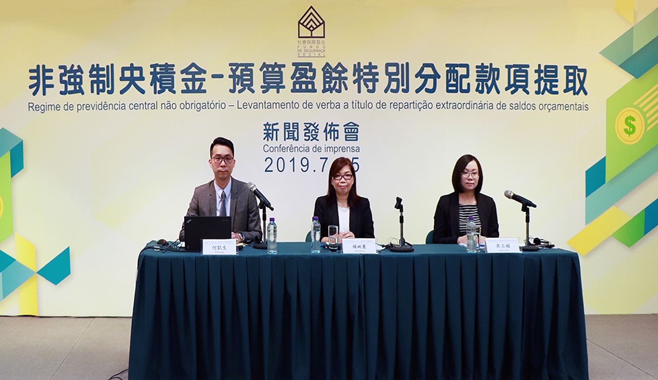 Representatives of the FSS attending the press conference were Ieong Iun Lai, Head of Department of Central Provident Fund System, Ho Hoi Sang, Head of Division of General Affairs of Provident Fund System and Leong Iok Mei, Technician in the same division.