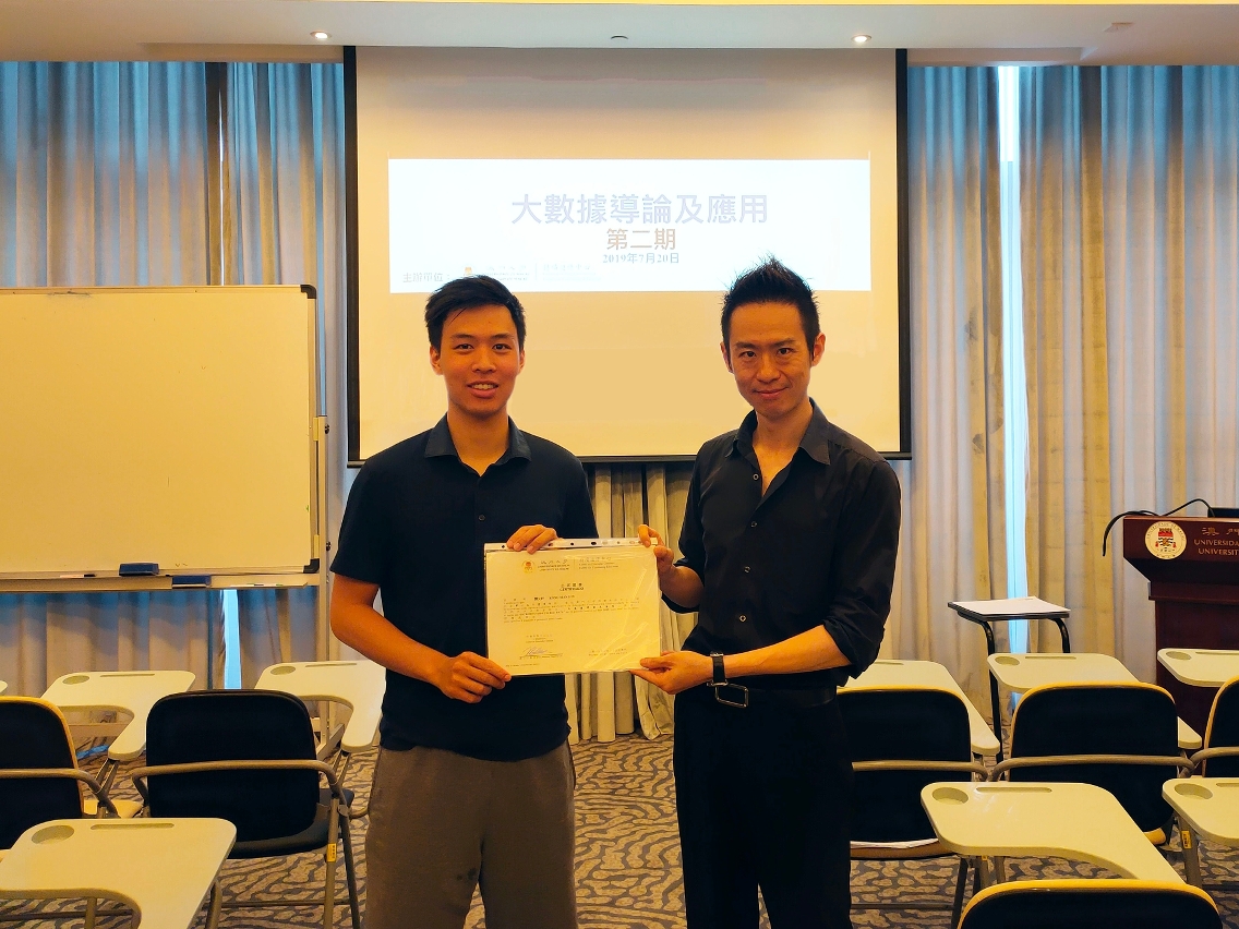 The certificate course was taught by a team of UM veteran faculty members. Through the application of big data for smart city development and case studies on different topics, including finance, law, health care, language and transport, students in the course learned about database management tools, data analysis, and the operation of machine learning tools. With this practical experience, students will be able to provide solutions for big data problems in a real world setting. For more information about the course, please call 8822 4545 or email to cce.enquiry@um.edu.mo.