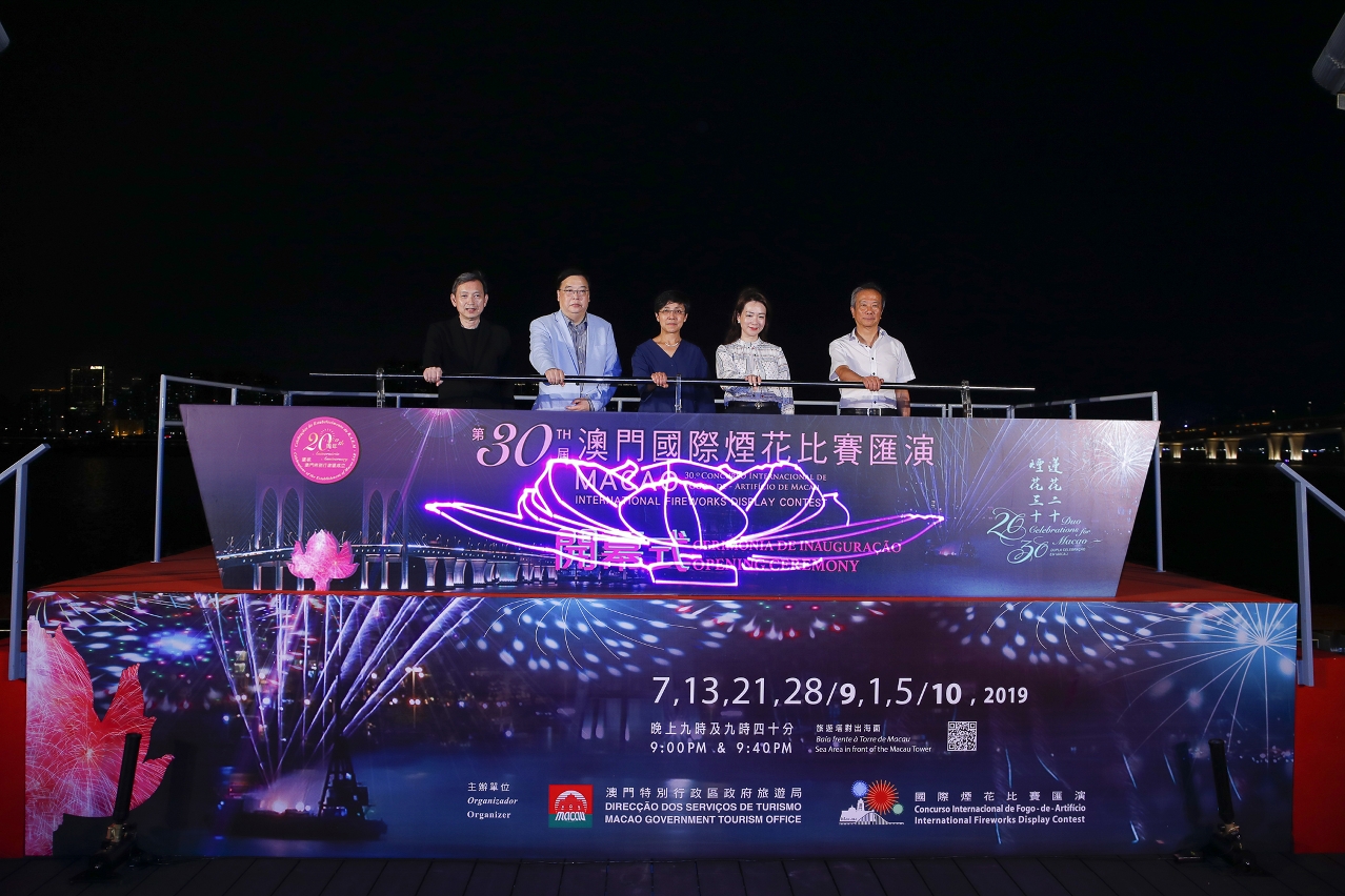 Officiating guests at the opening ceremony of the 30th Macao International Fireworks Display Contest include Director and member of the Executive Committee of TDM-Teledifusão de Macau, S.A., Frederico do Rosário, Director for Corporate Communications of CTM, Eliza Chan, Director of Group Marketing Department of Shun Tak Holdings and representative of Macau Cruise, Vincent Tung, and Vice President of the General Union of Neighbors Association of Macau, Lei Cheok Kuan.