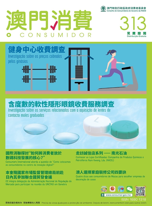 Consumers may access the magazine online on the Council’s official website and WeChat official account. Consumer Report is now also available free of charge at the Council (Av. Horta e Costa, N.º 26, Edf. Clementina Ho), and the service counter of the Council at Macao SAR Government Service Centre (Rua Nova da Areia Preta, Nº52), Public Information Centre at Vicky Plaza, libraries, and bookstores.