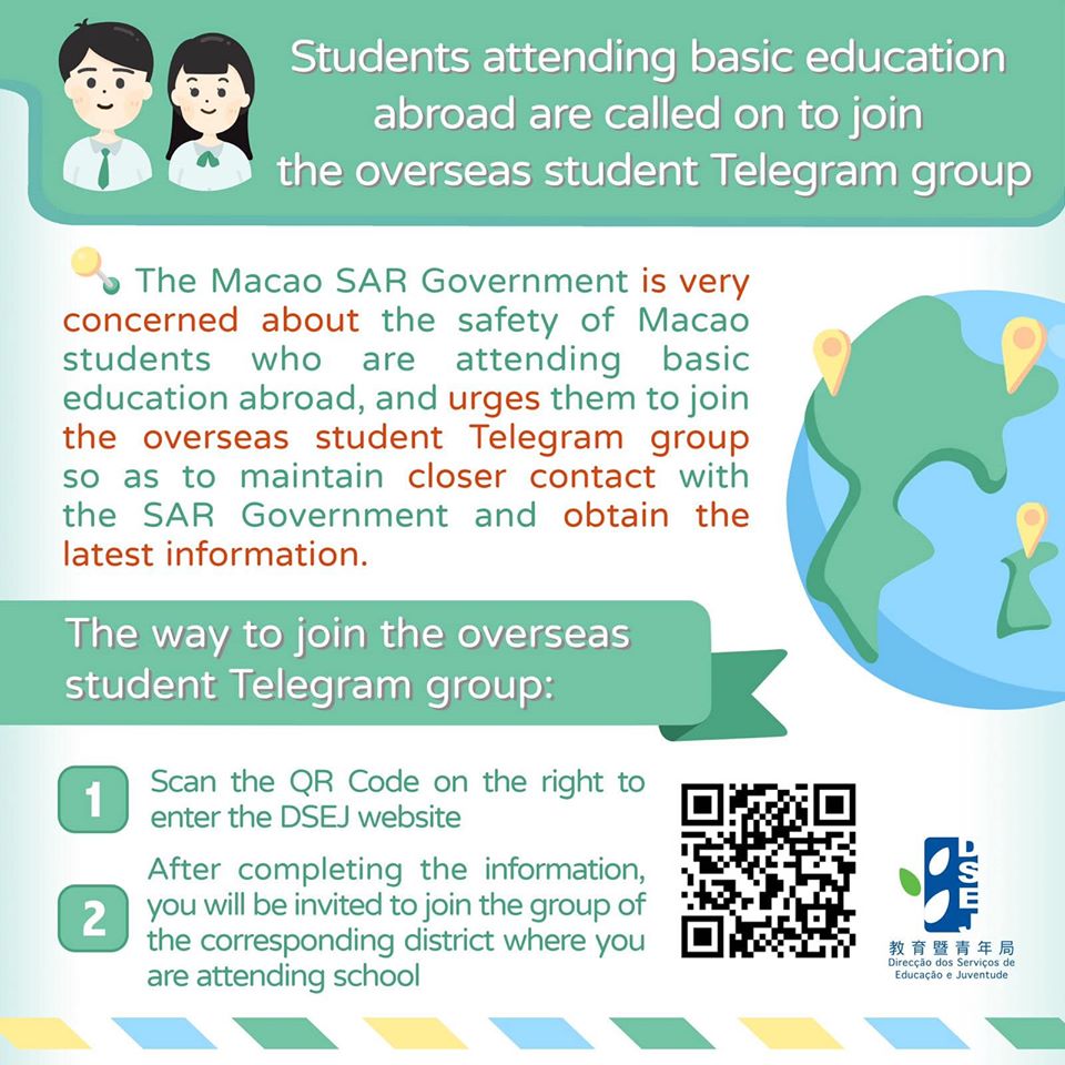 In view of the global spread of new coronavirus pneumonia, the SAR Government is very concerned about the safety of Macao students who are attending basic education abroad. The Education and Youth Affairs Bureau (DSEJ) cooperates with the Higher Education Bureau to expand the current overseas student Telegram group of the Higher Education Bureau to include both overseas higher education students and overseas basic education students in the Telegram group. The SAR Government hopes to maintain closer communication and contact with Macao students who are attending basic education in different countries, timely announce the Government’s latest care measures and information on epidemic prevention; Macao students who are attending basic education abroad and their parents are called on to join the group. The DSEJ has set up a special website (https://s.dsej.gov.mo/qa/Q0000109/). After completing the personal and schooling information, students and parents will be invited to join the group of the corresponding district where they are attending school.