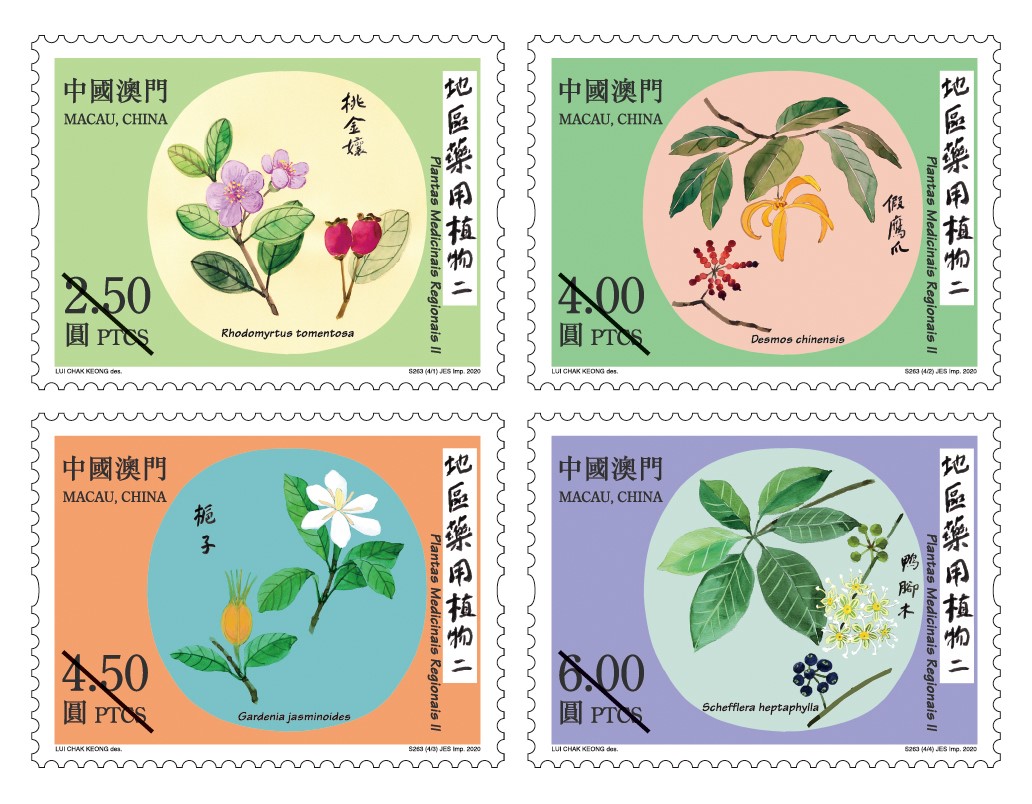 This issue includes a set of four stamps and one souvenir sheet, the stamps are illustrated the plants of Rose Myrtle (Rhodomyrtus tomentosa), Chinese Desmos (Desmos chinensis), Cape Jasmine (Gardenia jasminoides), and Ivy Tree (Schefflera heptaphylla), and the souvenir sheet is illustrated the plants of Chinese Chrysanthemum (Chrysanthemum indicum), Mexican Frangipani (Plumeria rubra ‘Acutifolia’), Honeysuckle (Lonicera japonica) and Red Cotton Tree (Bombax ceiba). This eight kinds of medicinal plants are all either wild or commonly cultivated in Macao, so that the public is concerned about protecting medicinal plant resources and the natural environment, as well as promoting the sustainable development of medicinal plant resources.