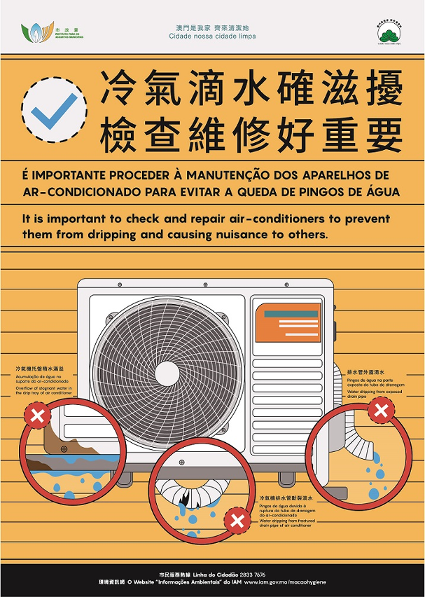 As summer approaches and the weather turns hot, there is a growing number of cases of water dripping from air-conditioners resulting from the increase in frequency of use of air-conditioners. The Municipal Affairs Bureau (IAM) urges members of the public to check the air-conditioners before using them. If any issue is found, professional air-conditioner technicians should be invited to conduct on-site inspection so as to avoid affecting others and environmental hygiene.